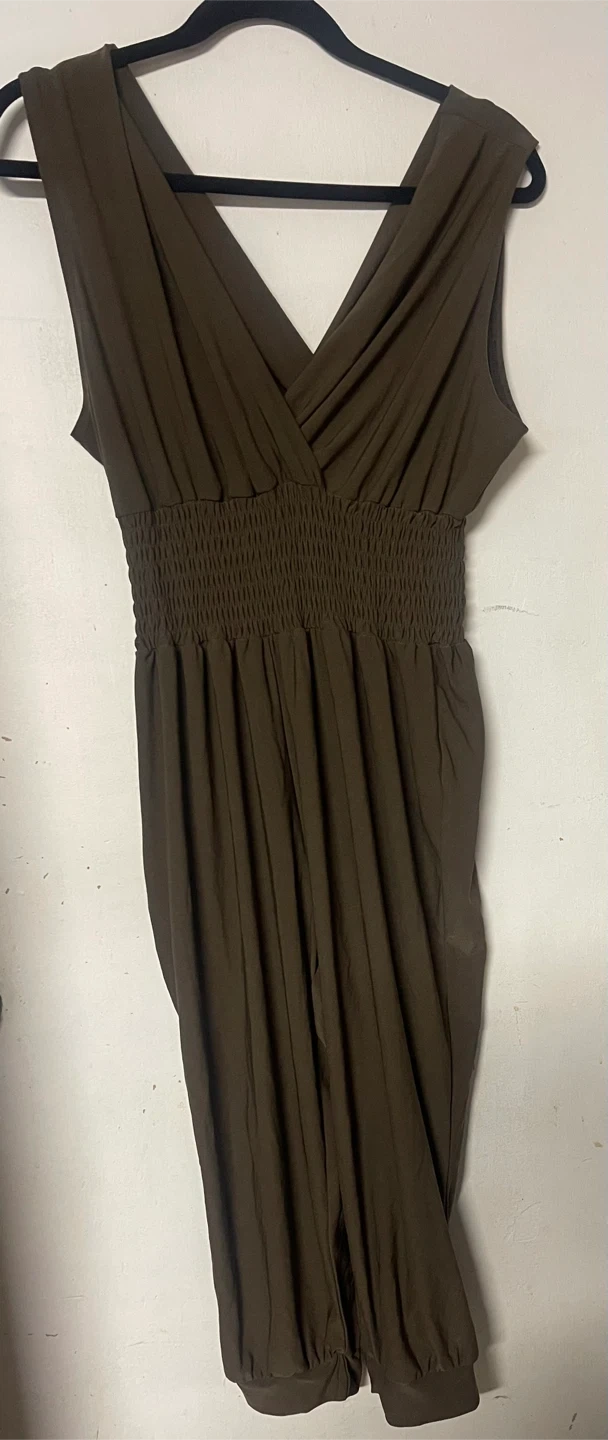 Item Details: This V-neck Romper feature a smocked waist and a relaxed fit. Clam Digger length with a cuff. Good stretch. Rooshed waistline. Made of a poly-blend which gives it a comfortable fix.