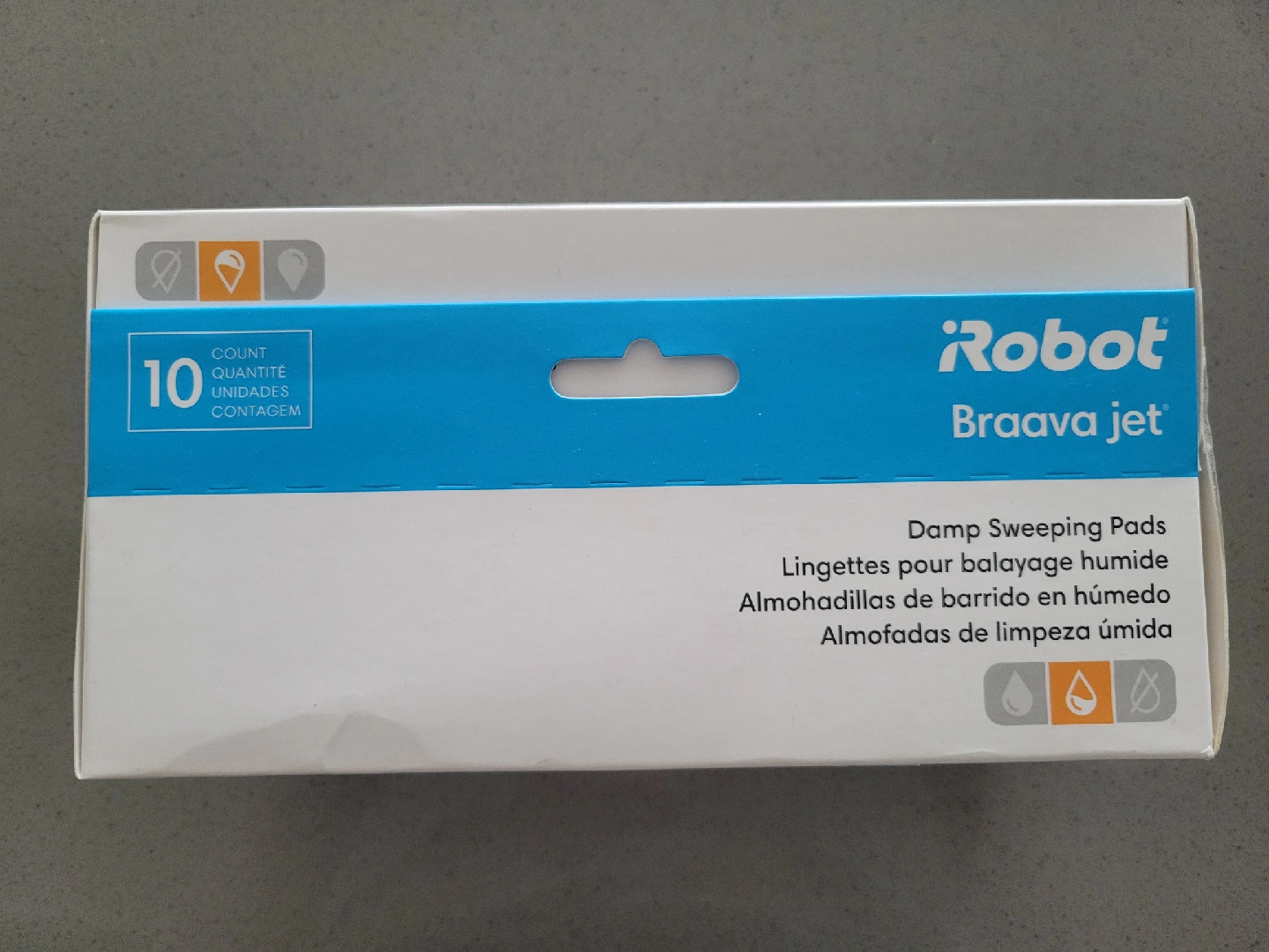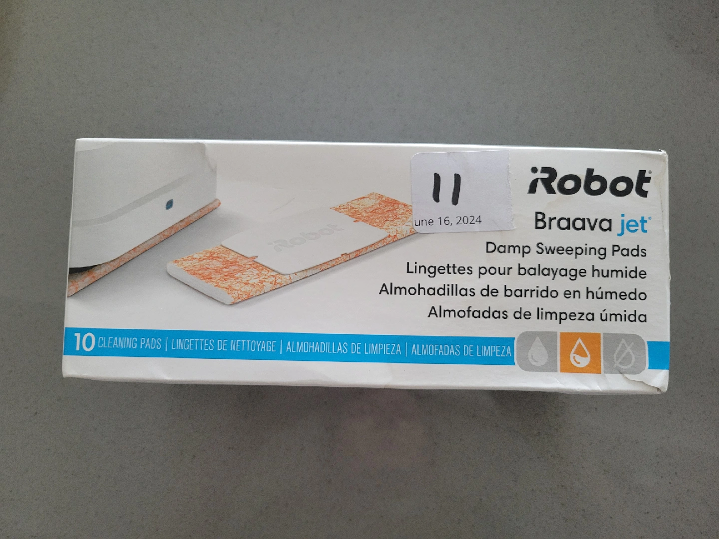 Selling a pack of iRobot Braava Jet Damp Sweeping Pads. The box contains 10 cleaning pads for your Braava jet robot mop. New in Box.