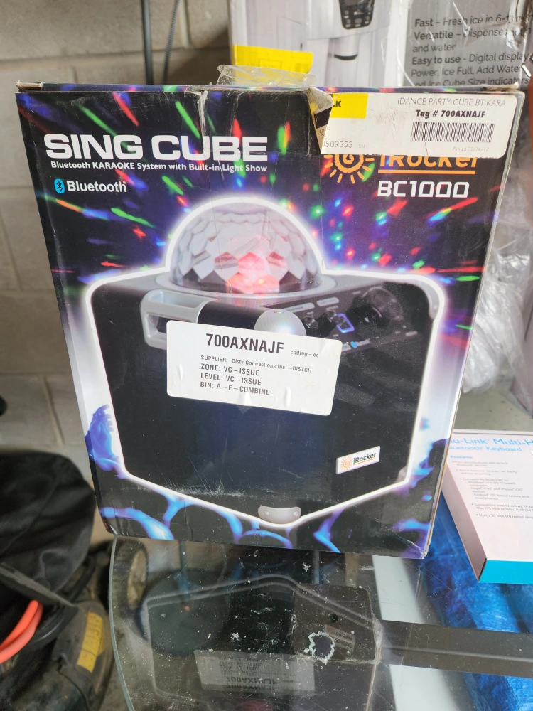 Selling an iRocker Sing Cube Bluetooth karaoke system with a built-in light show! It's the BC1000 model. Perfect for parties and fun get-togethers. The box has some wear, but the system itself is in great shape!