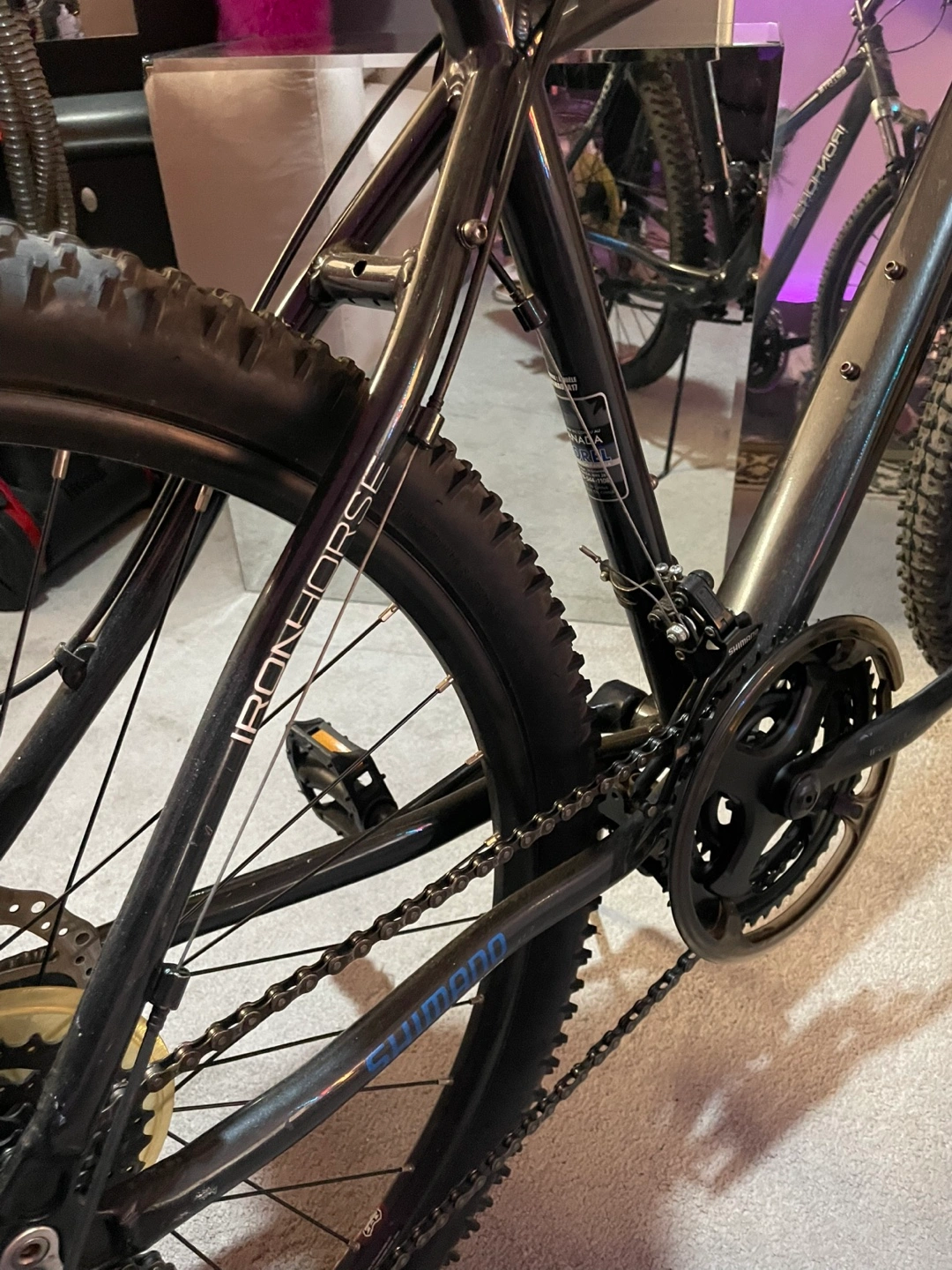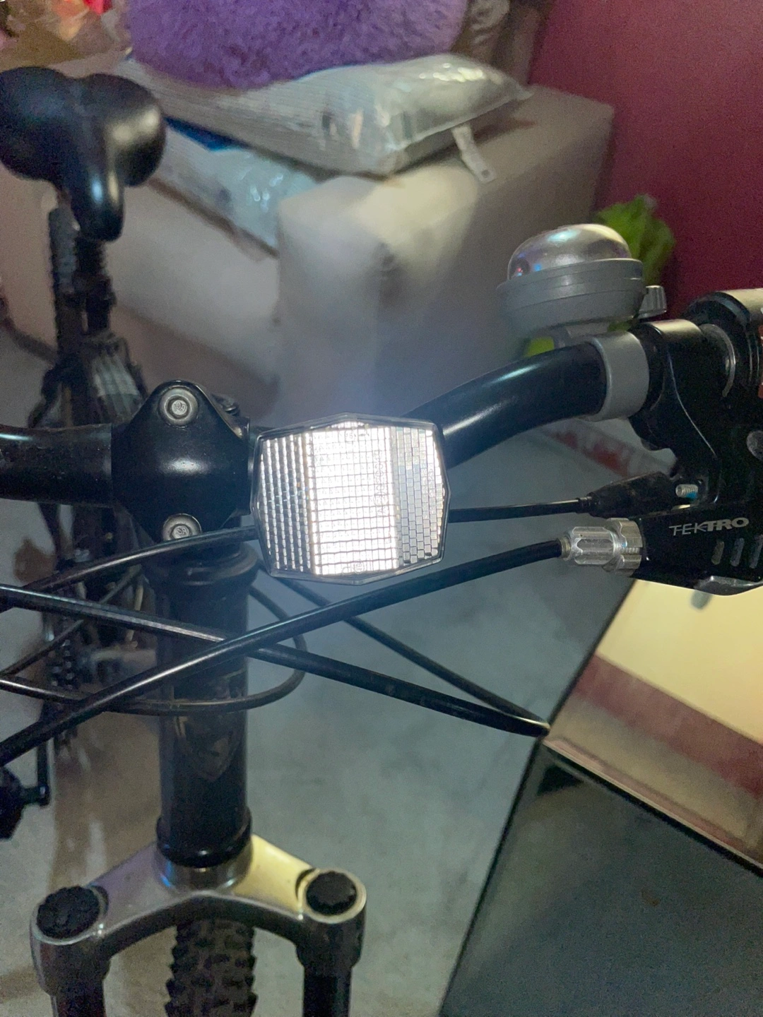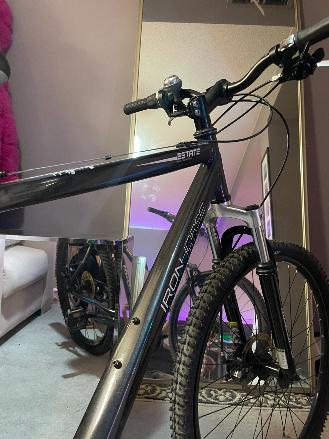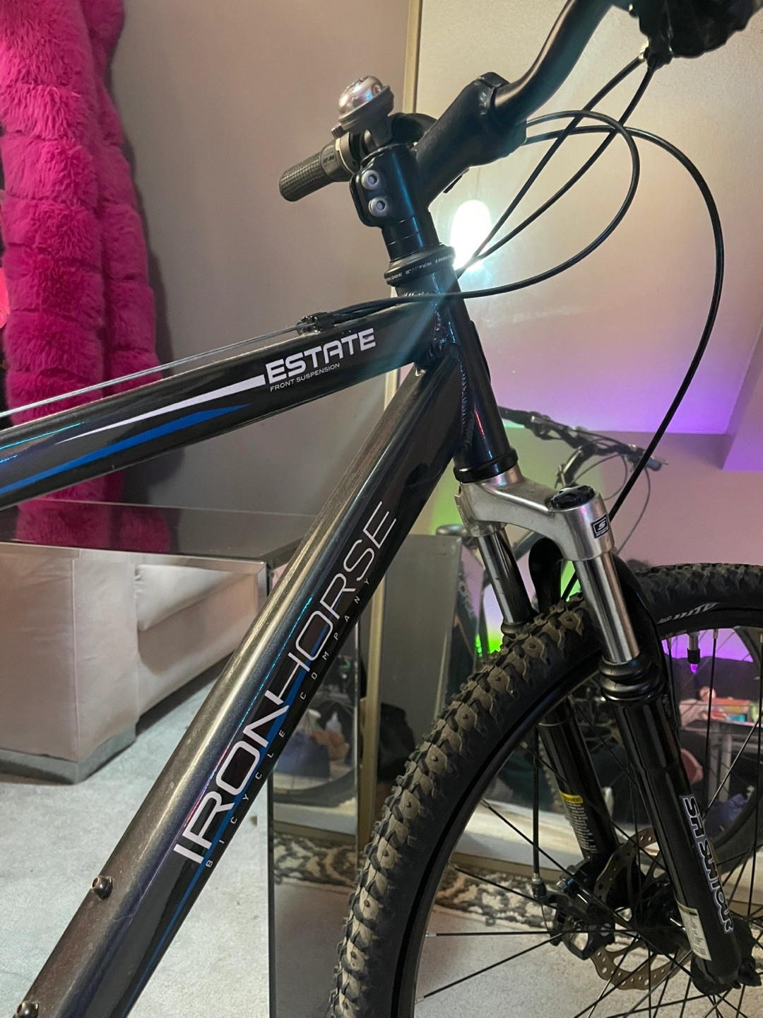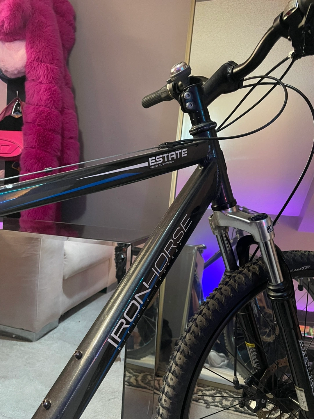Black mountain bike with front suspension, front light, and bell. Pick-up only.