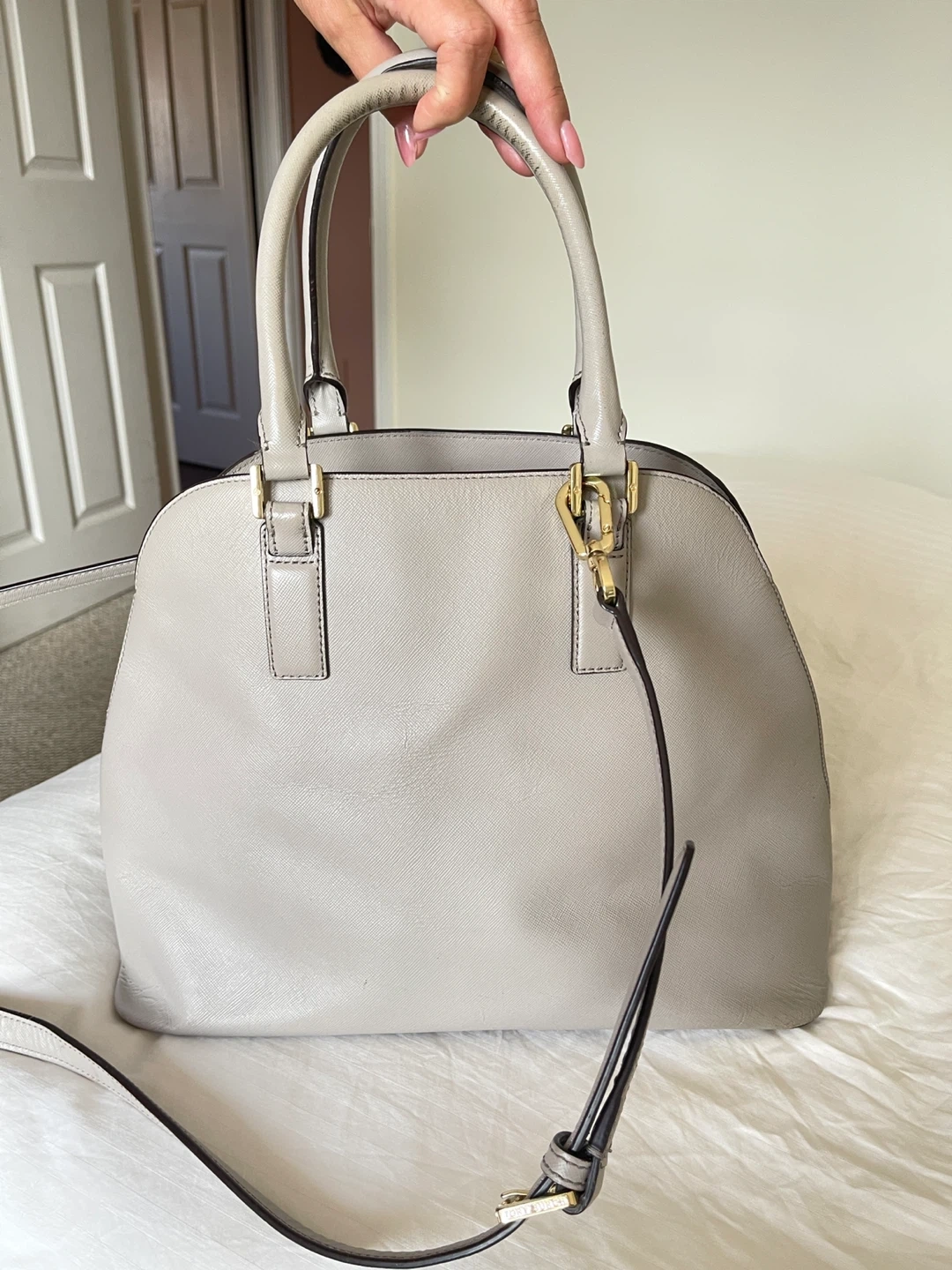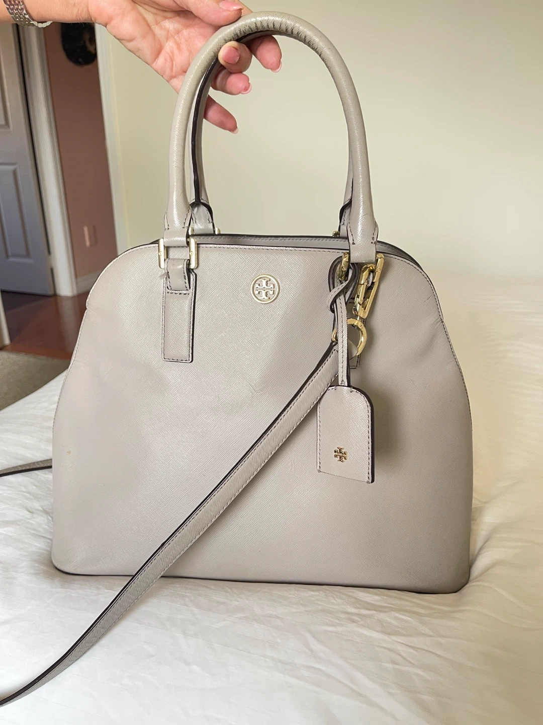 This is a Tory Burch satchel handbag. It's made of grey leather with gold hardware. The interior features a patterned lining and multiple pockets.