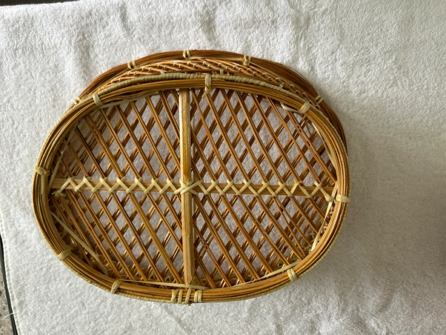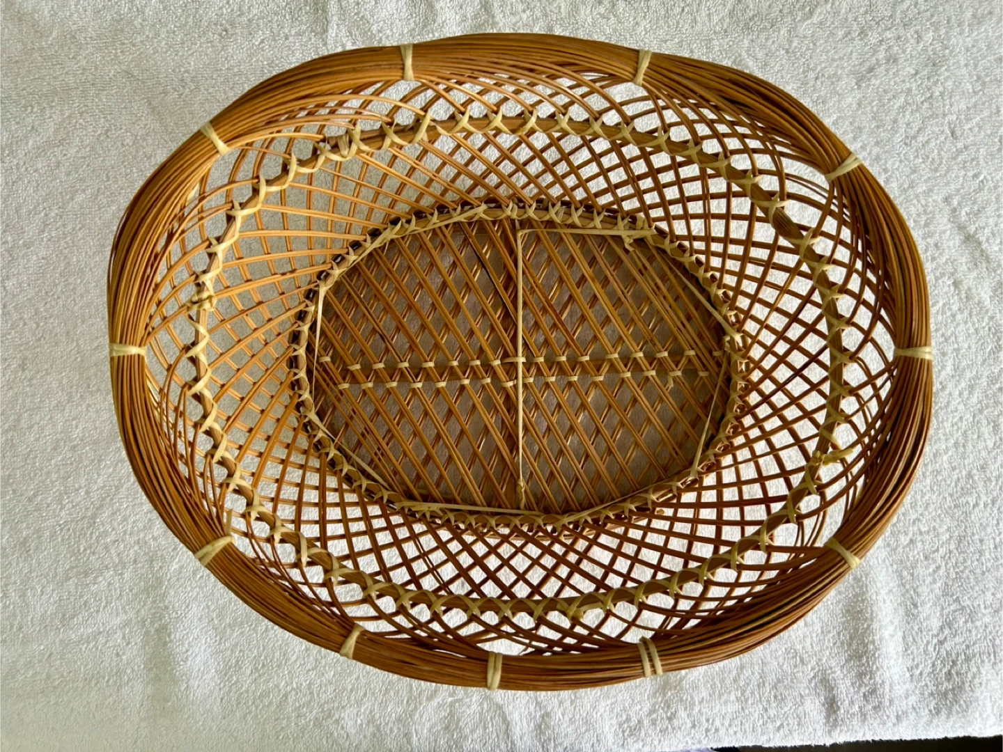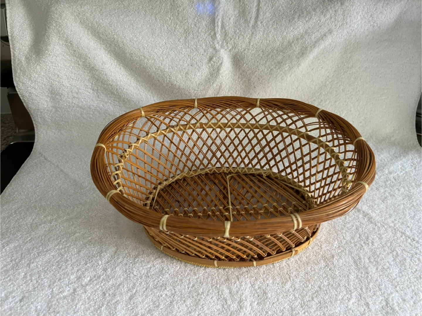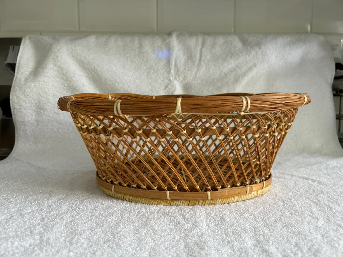 Oval basket, 12.25”L x 10”W (top), 9.25”L x 7”W (bottom).