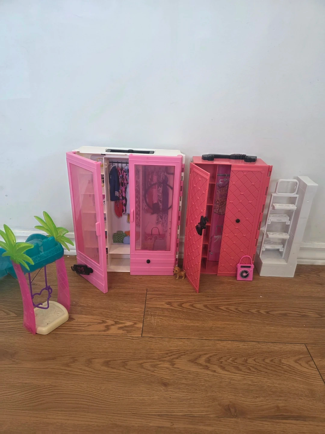 This Barbie doll wardrobe set includes two pink wardrobes, a blue slide, and a white staircase. It's great for organizing doll clothes and accessories. This playset is perfect for imaginative play!