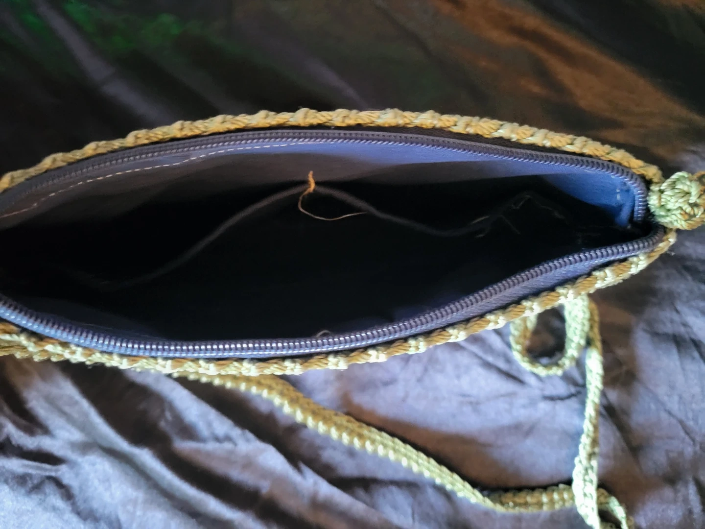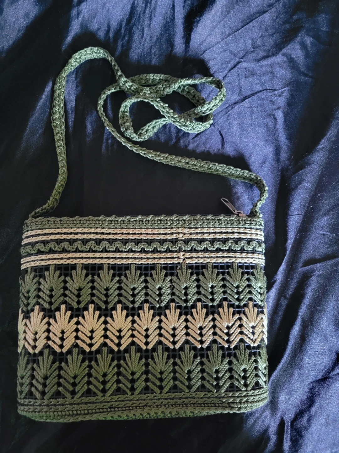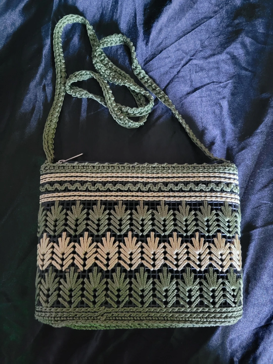 This is a unique woven crossbody bag with a distinctive leaf pattern. It has a zippered closure and a fabric lining with an inner pocket. The strap is also woven.