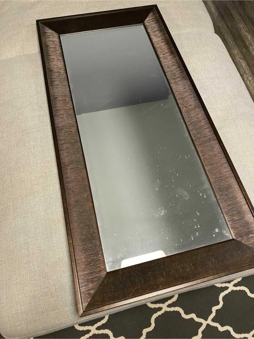 This decorative wall mirror features a dark brown wood-look frame with a textured finish. It's a nice size for an entryway or bedroom. This mirror would add a touch of elegance to any room!