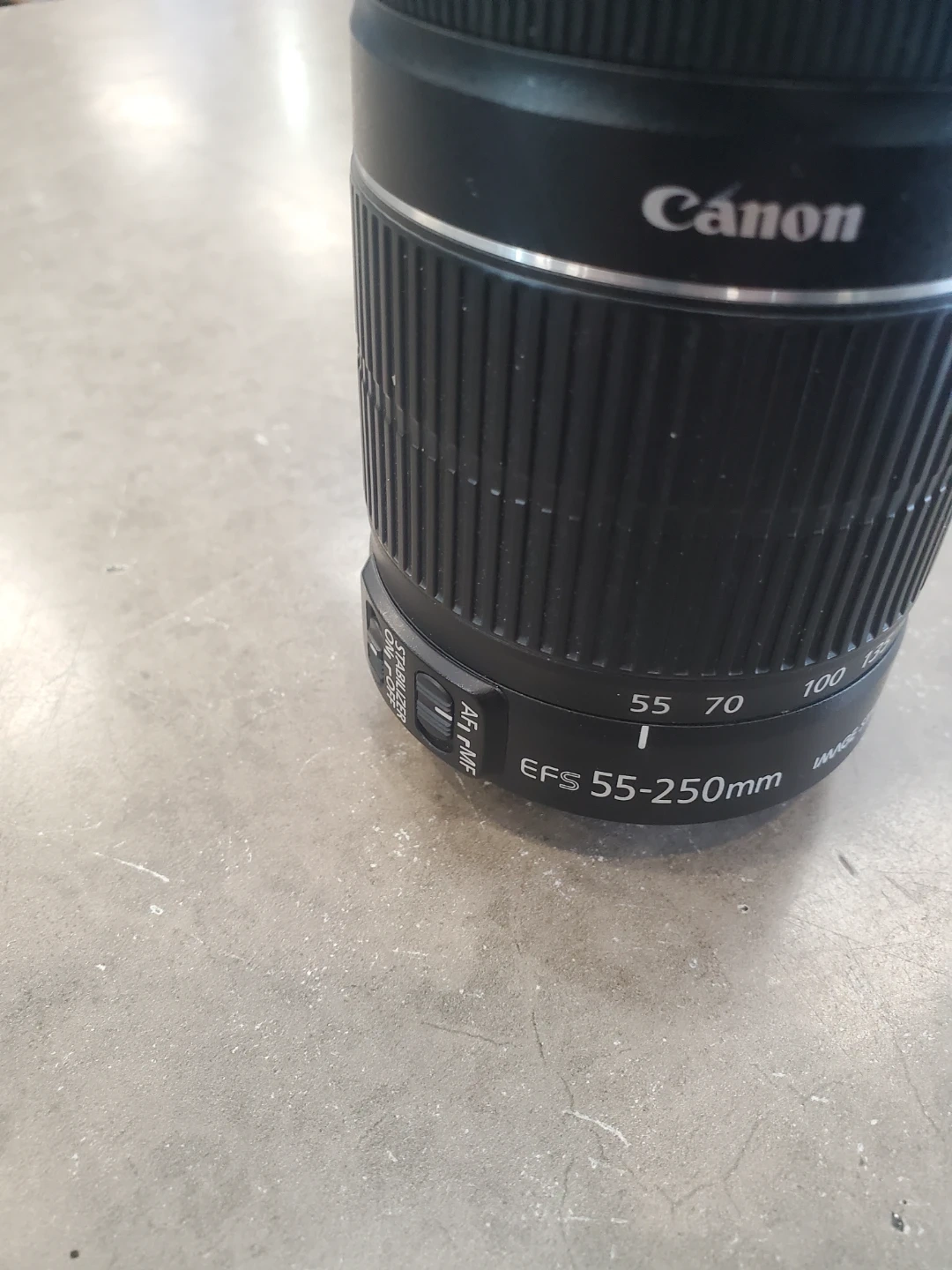 Canon EFS 55-250mm image stabilizer lens. Aperture range 1:4-5.6. Macro focusing distance is 1.1m/3.6ft. This lens is great for capturing sharp images from a distance!
