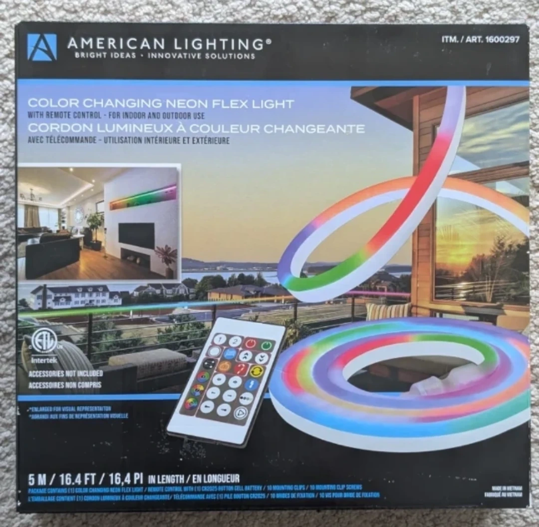 This American Lighting Color Changing Neon Flex Light comes with a remote control for indoor and outdoor use. It's 5 meters or 16.4 feet in length. Package includes light strip, remote control, battery, mounting clips and screws.