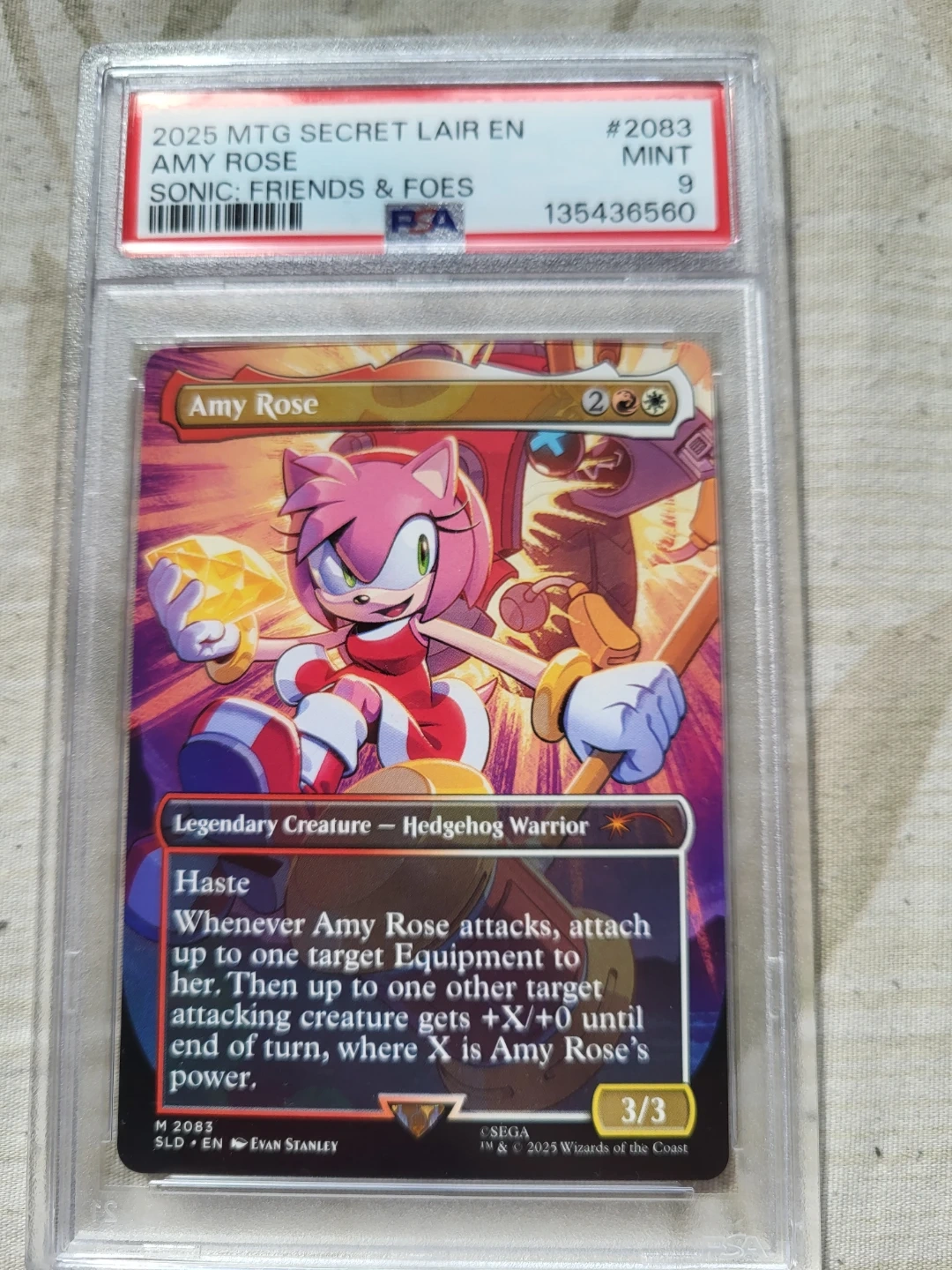 This is the Amy Rose Legendary Creature card from the Magic The Gathering Secret Lair Sonic: Friends & Foes set. It's a Hedgehog Warrior with Haste. The card is graded Mint 9 by PSA. It features artwork by Evan Stanley.
