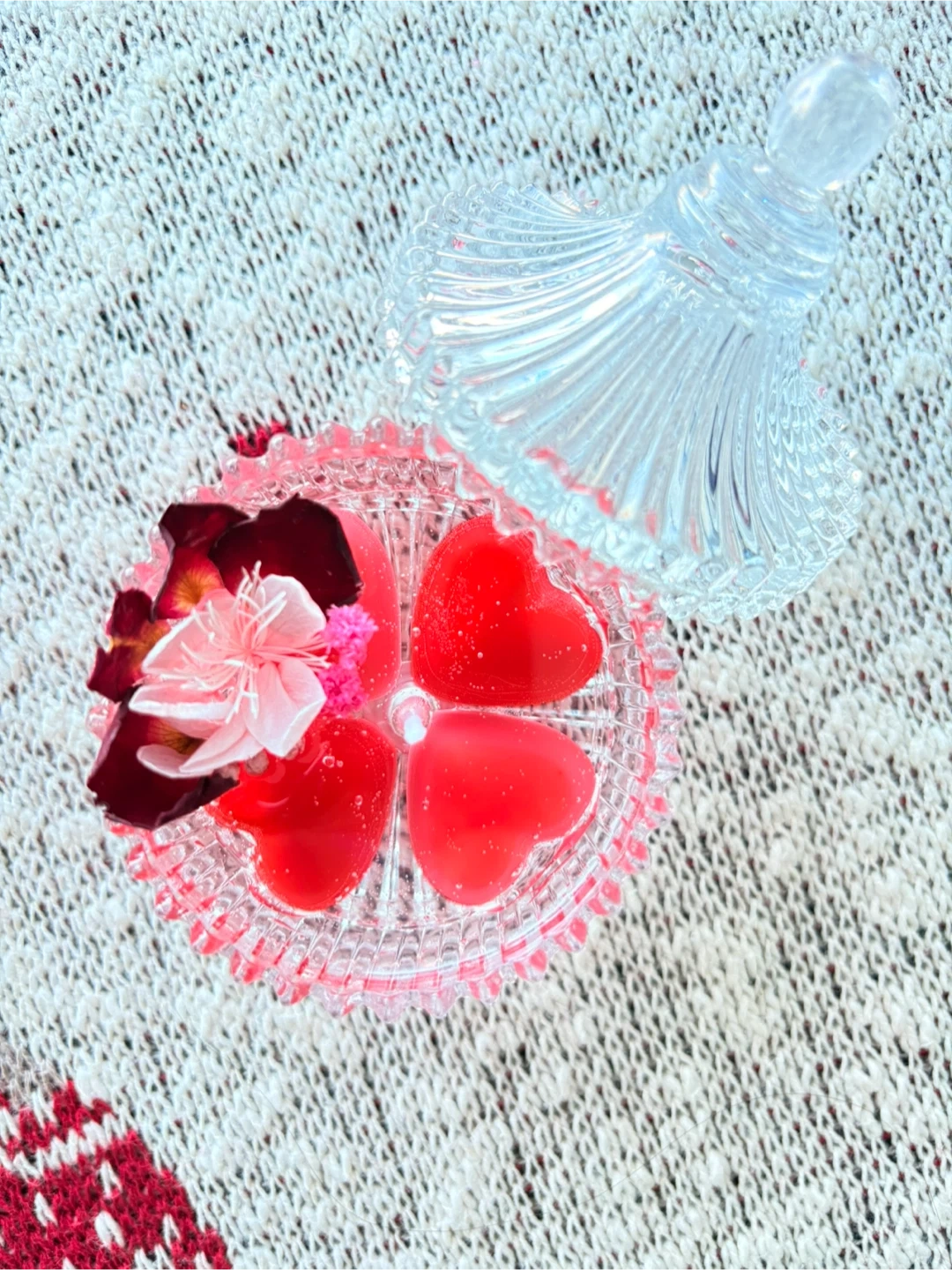 This heart-shaped crystal candle is made of clear glass, dried flowers, and natural wax, and comes with a decorative lid. It's perfect as a home decoration and ambiance-creating ornament. It measures approximately 6.5 cm in diameter and contains four red heart-shaped scented candles.Buy 2 get 1 free!