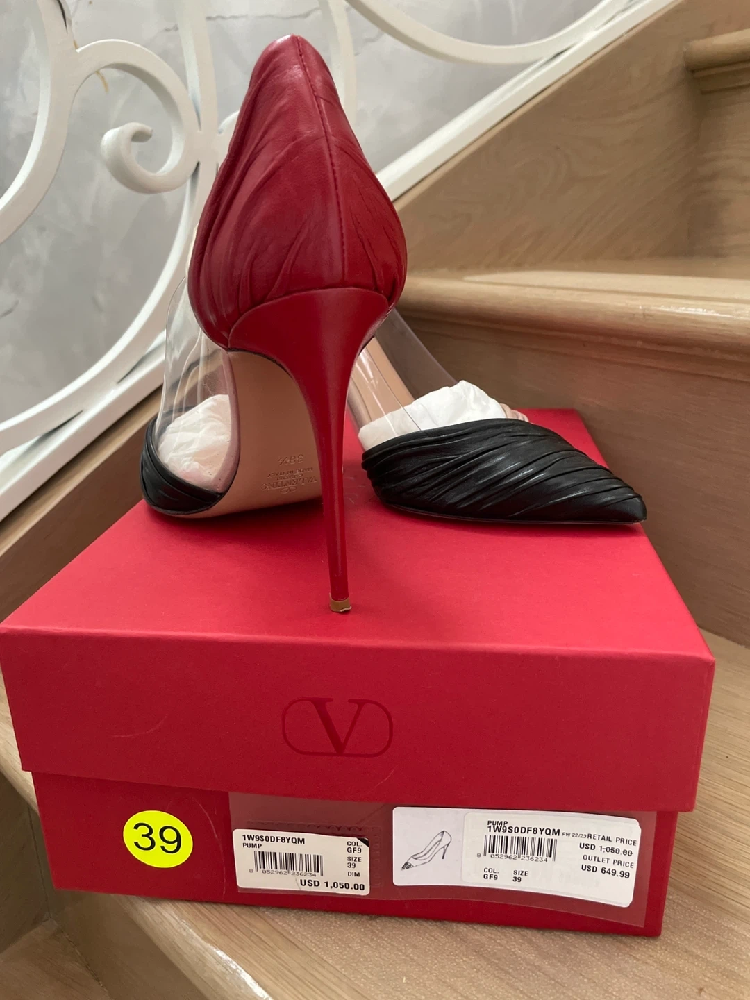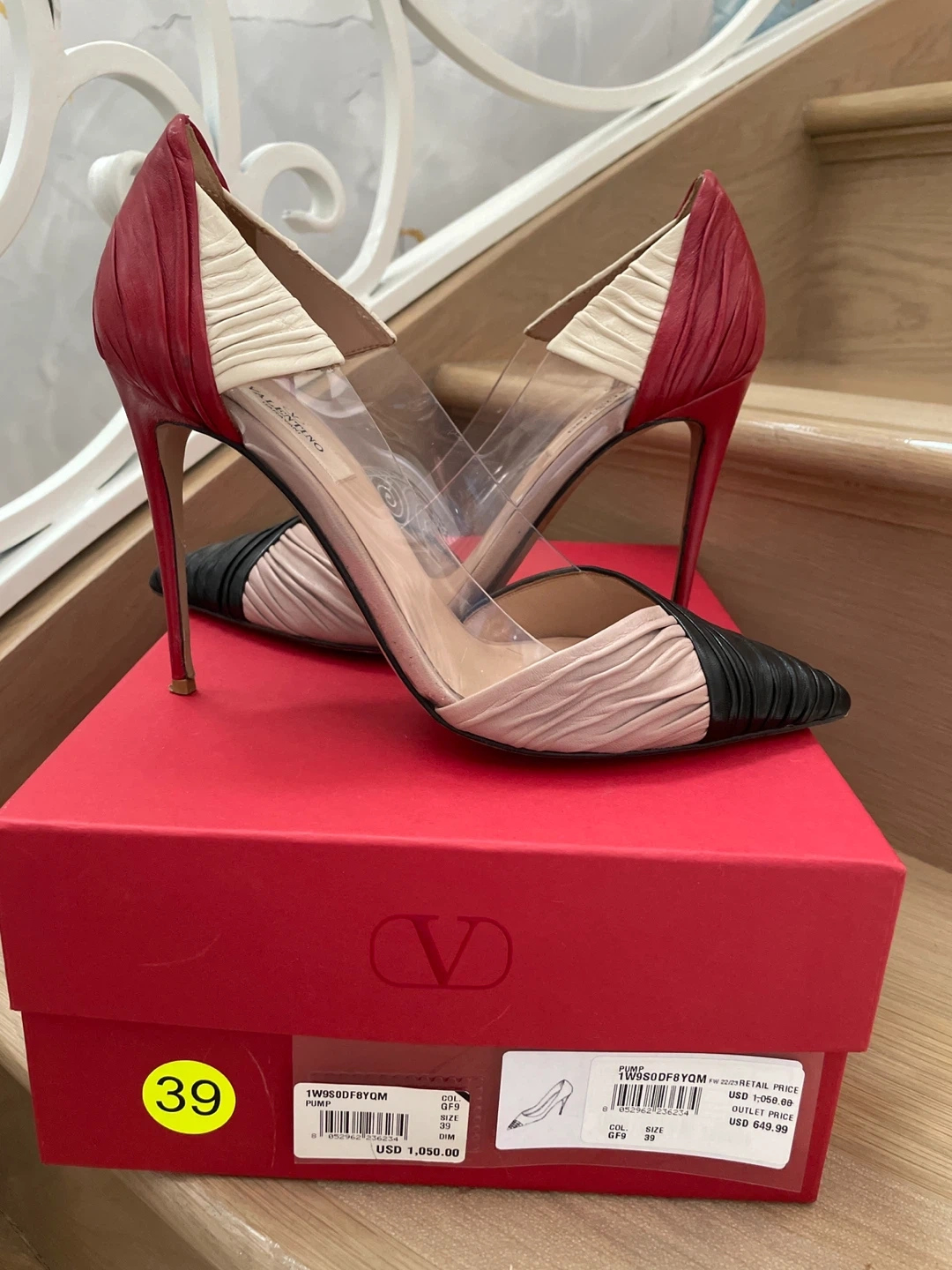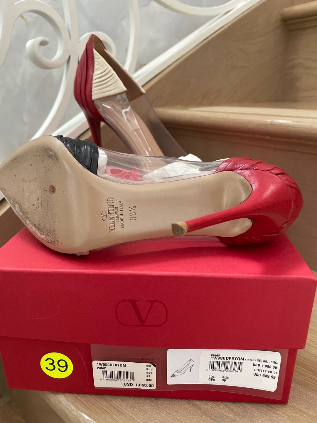 These are Valentino heels in size 38.1/2 They feature a mix of red, white, and black leather with clear PVC accents. Made in Italy. Original price $ 980.00