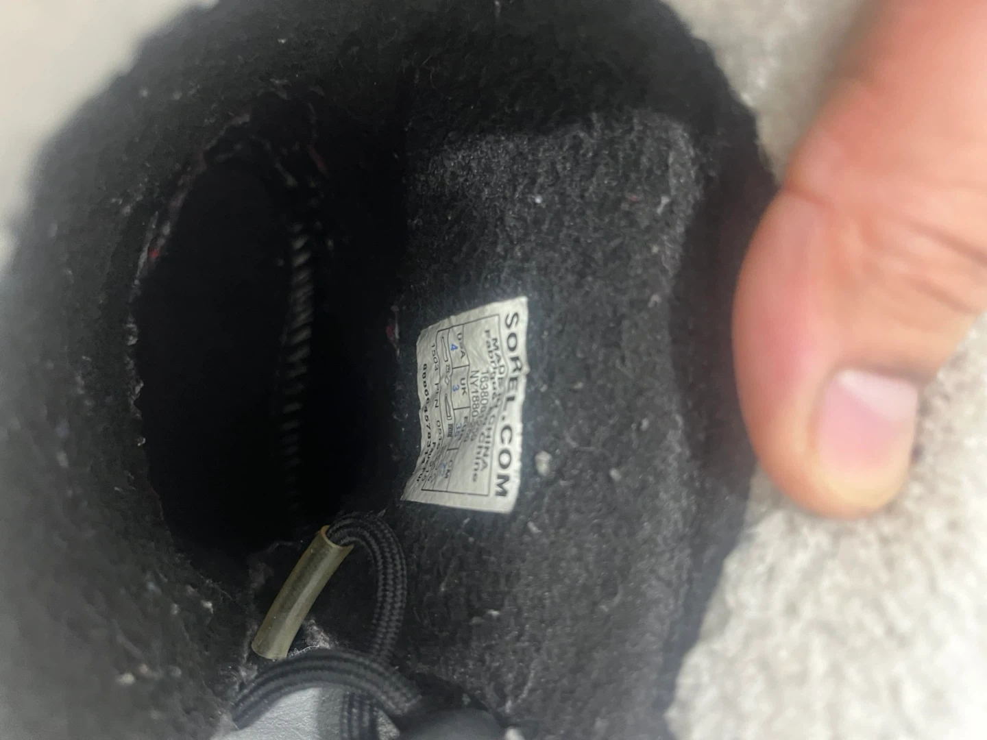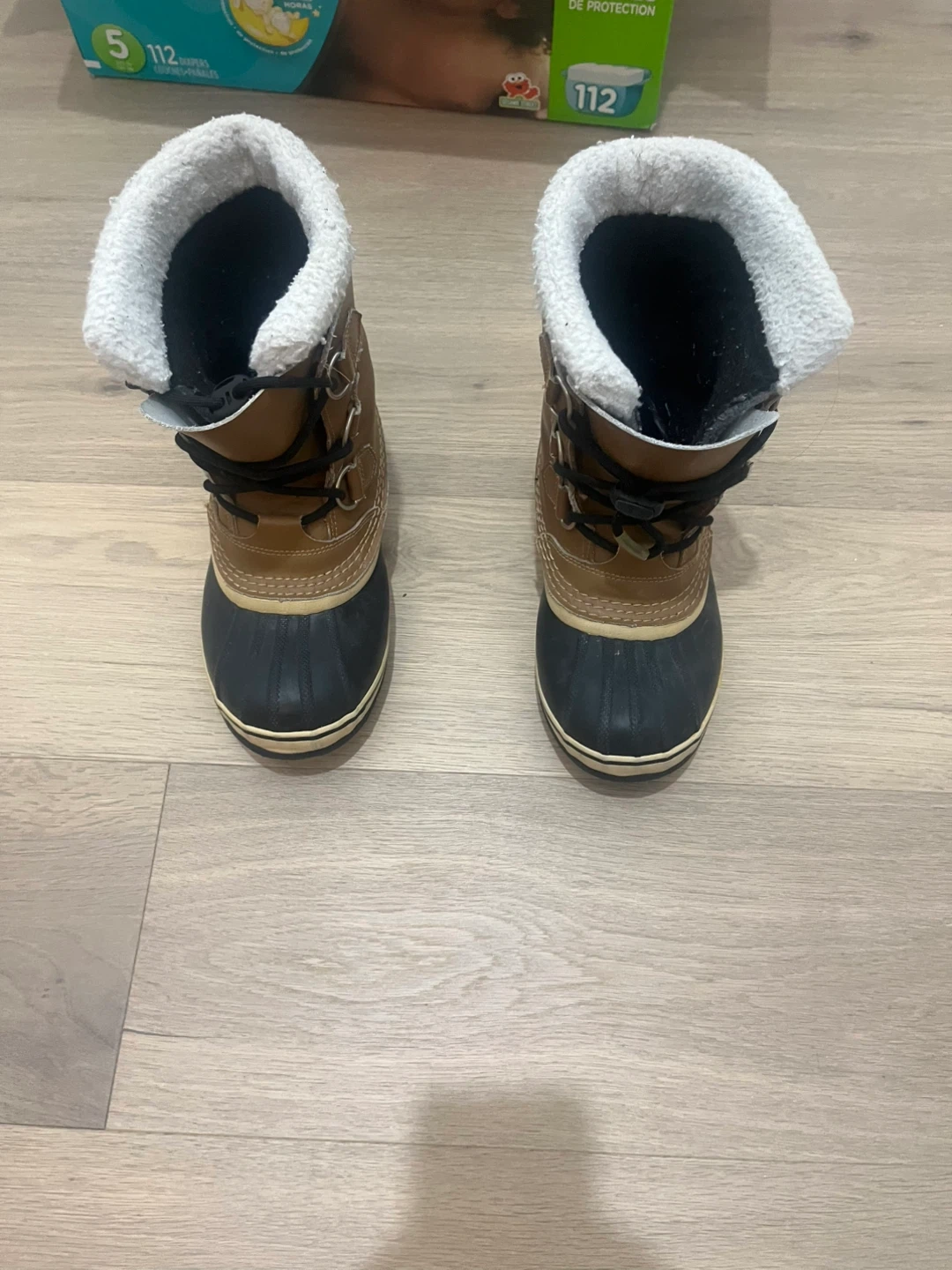Brown and black Sorel winter boots with a fuzzy lining. They're waterproof and insulated for warmth. Great for keeping feet dry and toasty in the snow!