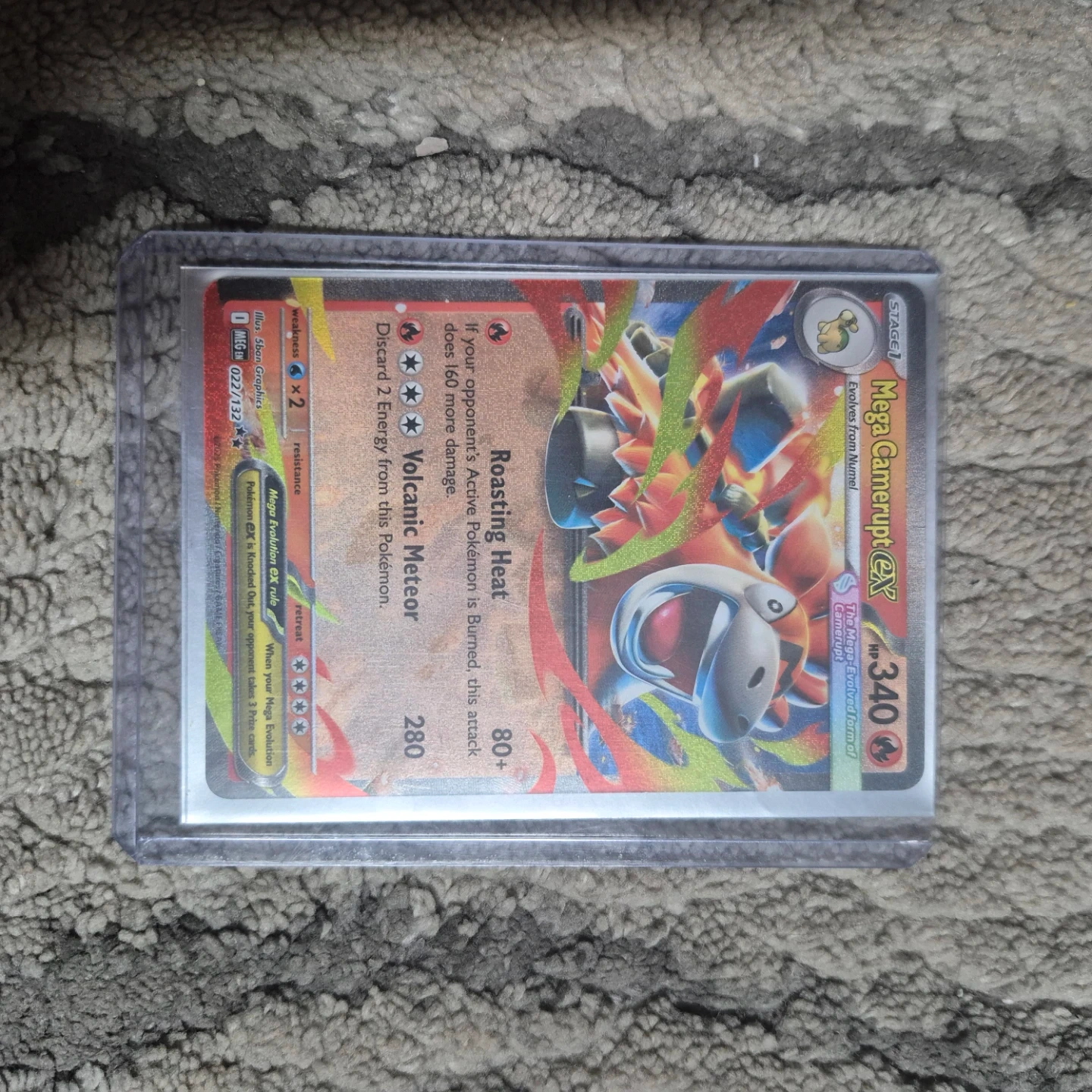 This is a Stage 1 Mega Evolution Pokémon card featuring Mega Camerupt-EX. It has 340 HP and its attack 'Volcanic Meteor' does 280 damage. The card comes from the XY Evolutions set.
