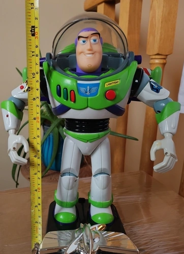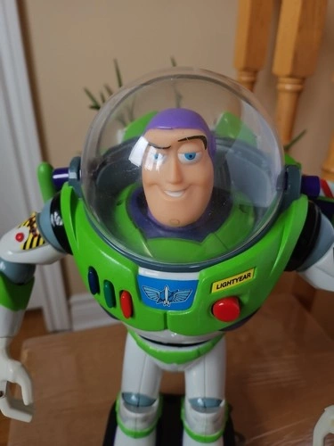 This is a vintage 1990s Disney Pixar Thinkway Toys Buzz Lightyear action figure from Toy Story. It's a 12-inch tall collectible space ranger in his signature outfit. Made of durable plastic, this figure was manufactured between 1990 and 1999. It features a light-up function (batteries required) and a talking function with Tim Allen's voice. This is an original, uncustomized representation of the character. It does not come with the original packaging. Let me know if you're interested!