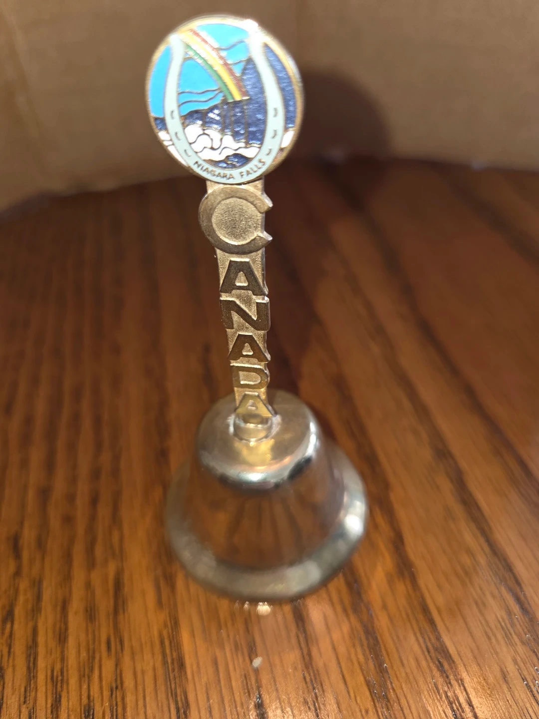 This souvenir bell features an enamel top depicting Niagara Falls with a rainbow. The handle has the word 'CANADA' spelled out vertically.