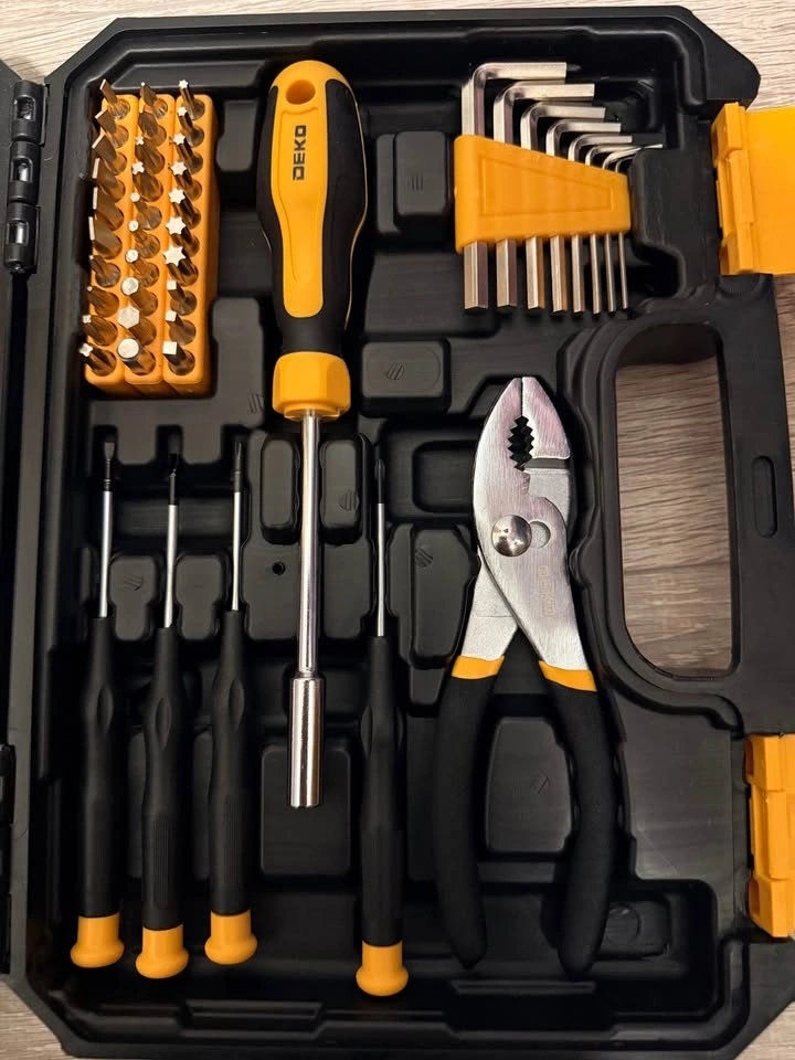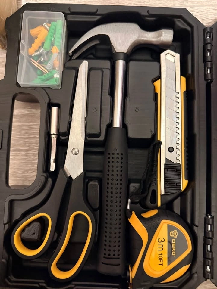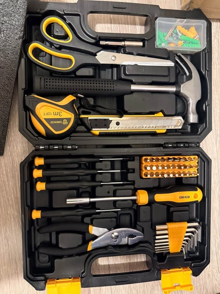 Brand new DEKO home tool kit in original case. Never used, everything in perfect condition. Includes hammer, pliers, screwdrivers, precision set, utility knife, 3m tape measure, drill bits, hex keys, wall anchors & more. Perfect for home repairs, DIY, apartment, or as a gift. Condition: Brand new. Pickup in Surrey. Cash or e-transfer.