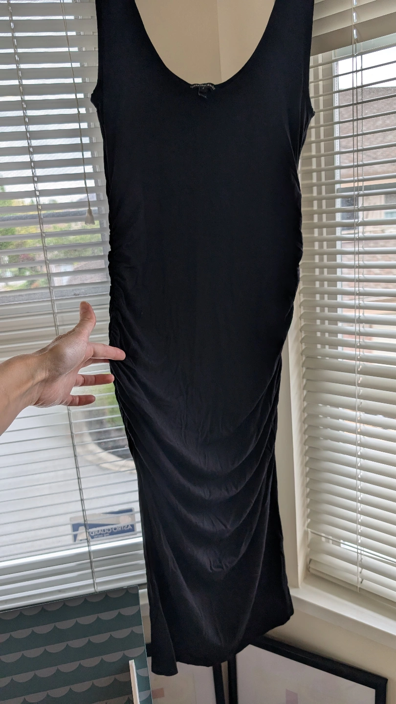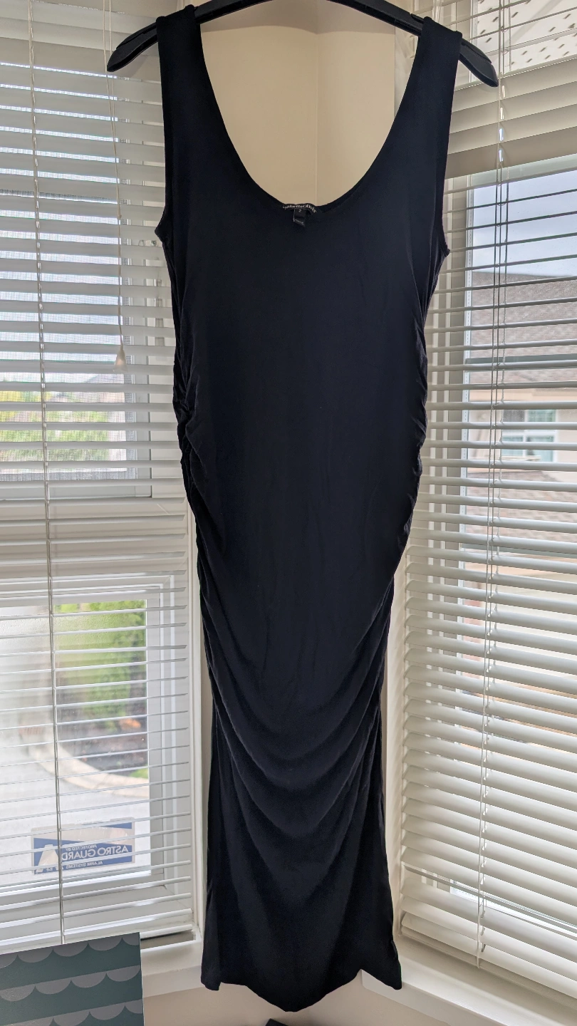 15Flattering and pared-back LBD to live in right through pregnancy. Dress it up for work or lunch and dial it down with a denim jacket and trainers on weekends. The ruched waist feature grows with the bump and the soft, eco-friendly jersey feels great against skin. It wears and washes brilliantly. Built-in shelf bra for comfort and support. Side seam ruching to ensure a flattering fit at all stages. Smoke and pet free home. Pick up Dover Cresent, Richmond.