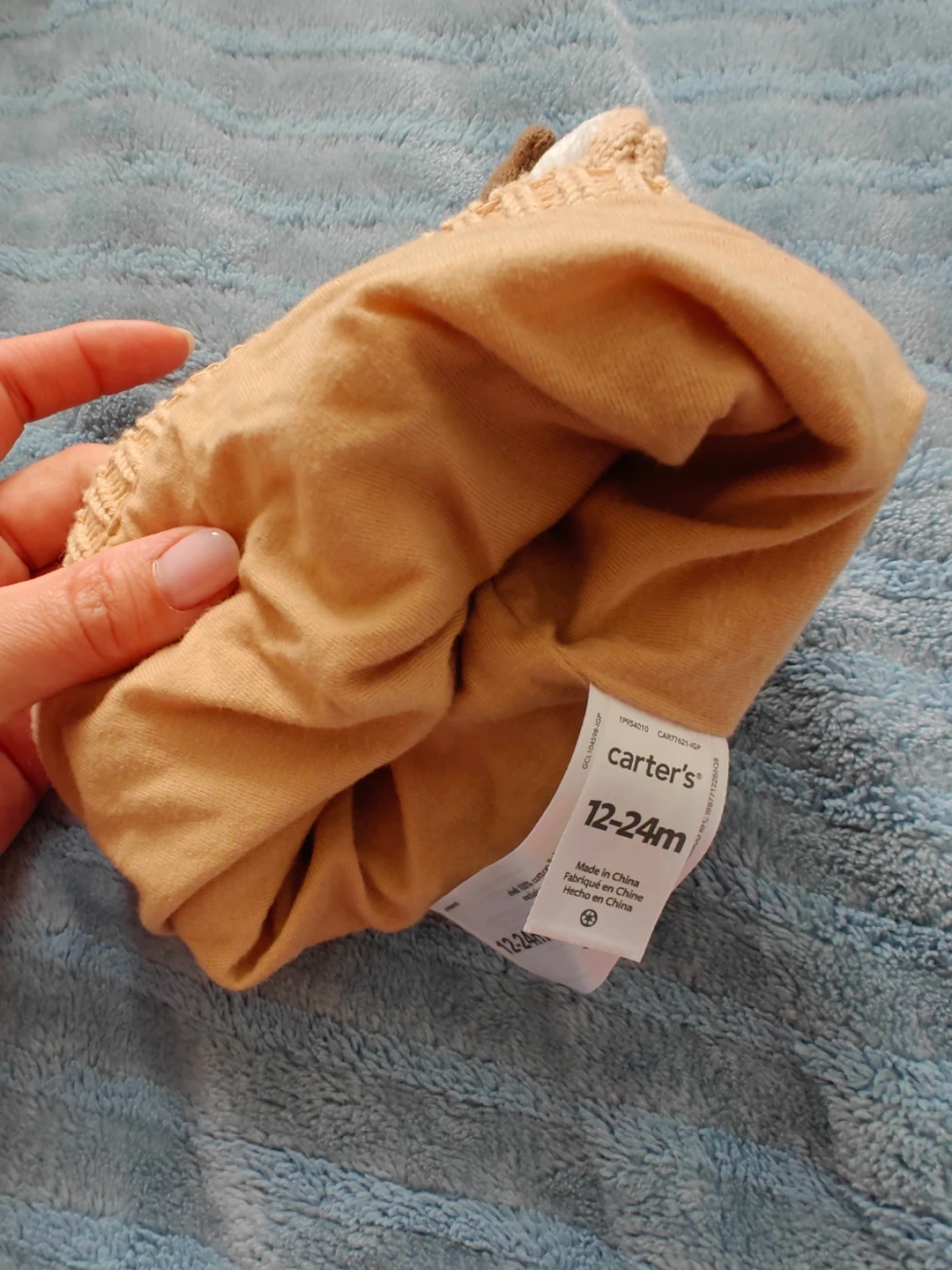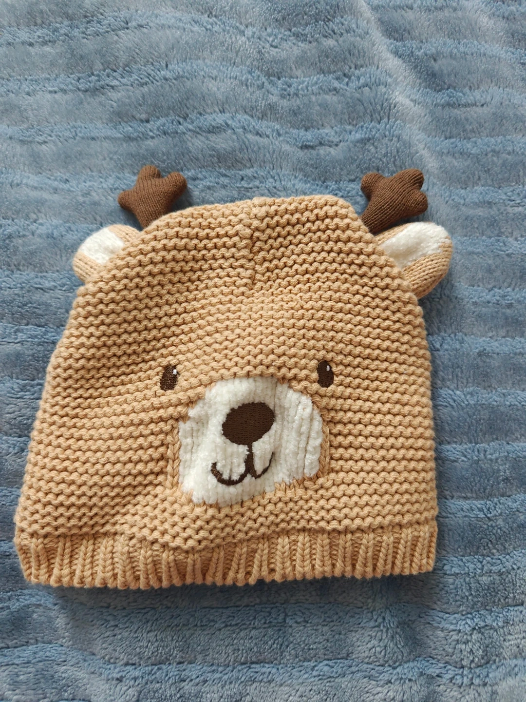 This cute knit hat is designed to look like a bear with adorable little antlers. It's made from a soft, beige-coloured yarn and features embroidered facial details. The hat has a cozy ribbed brim for a snug fit. It's perfect for keeping little ones warm and stylish during colder weather!