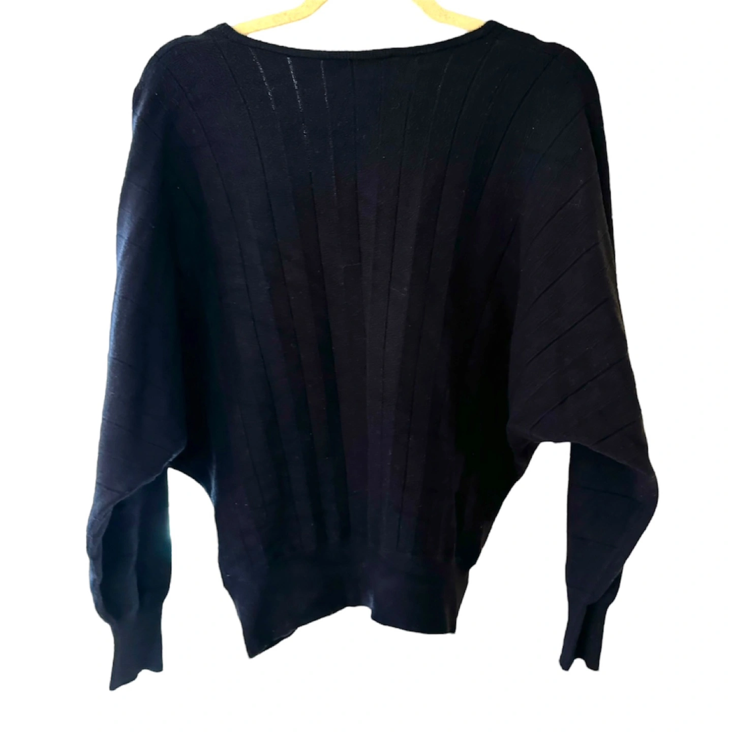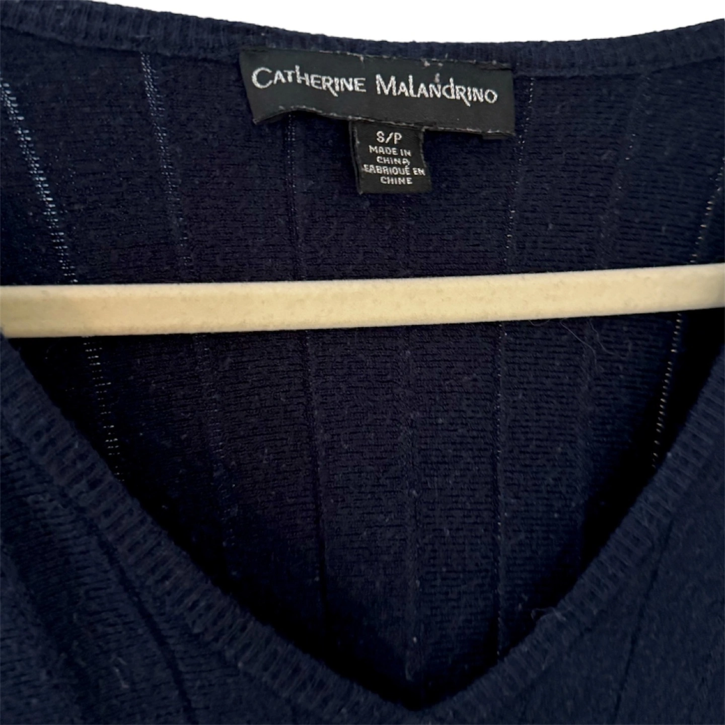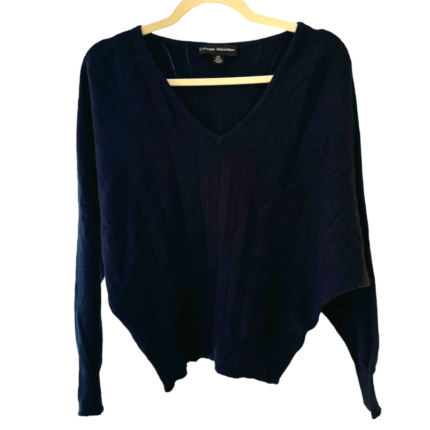 Navy blue V-neck sweater with ribbed detailing by Catherine Malandrino.