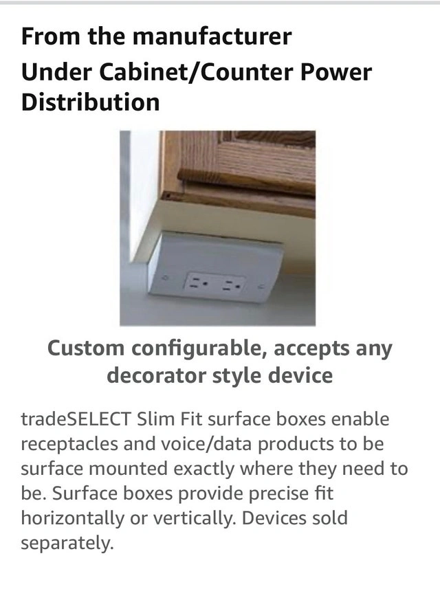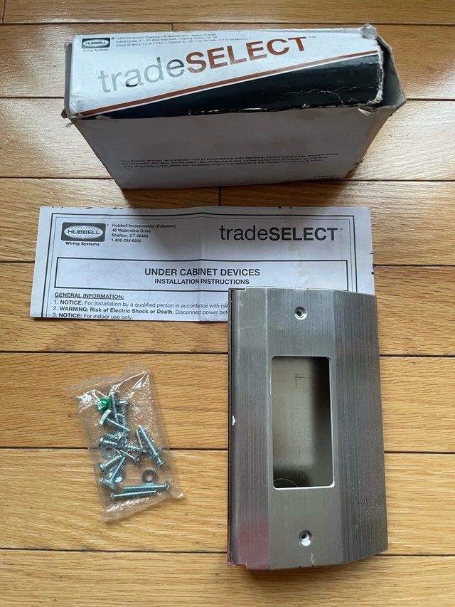 New Hubbell Wiring Systems RU100W tradeSELECT Metal Under Cabinet/Counter Power Distribution Slim Fit Box. These boxes provide a convenient, out-of-sight way to distribute power and voice/data. They comply with the NEC for kitchen receptacles, with placement not more than 20 inches above the counter surface. They can also be placed under counter islands, not lower than 15 inches from the surface. Custom configurable, accepts any Decorator style device. Mounting hardware included. Price firm. Pickup can be arranged in Brampton, Mississauga, Oakville, Burlington, Hamilton.