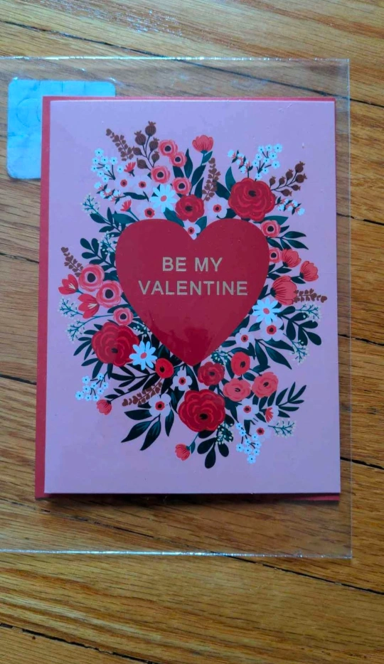 Floral Valentine's Day card. Features a large heart with the text "Be My Valentine". Pink background with red and white flowers.