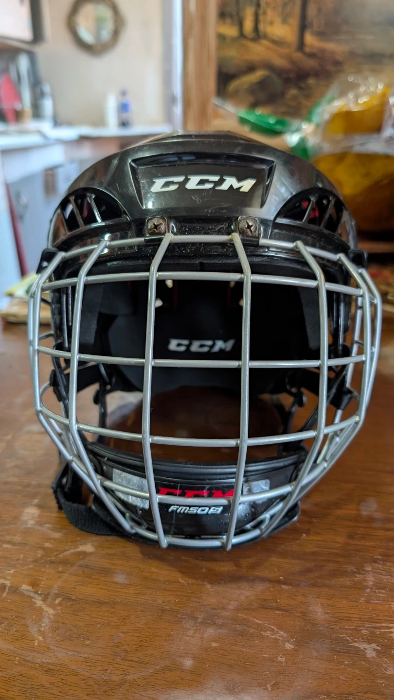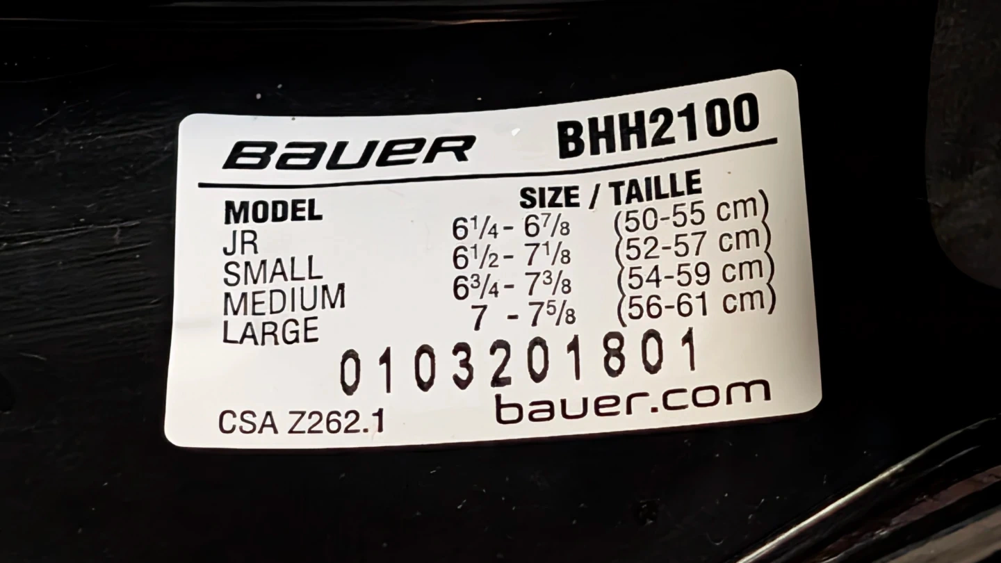 This is a Bauer BHH2100 hockey helmet, designed for youth players. It's a black helmet with a silver cage. The label indicates sizes Junior, Small, Medium, and Large for head circumferences from 50-61 cm.