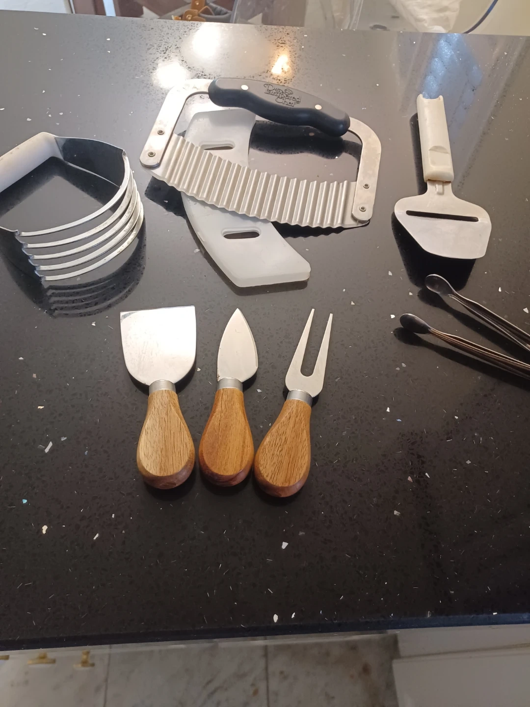 This kitchen gadget set includes a pastry blender, a wavy cutter(pampered chef) a cheese slicer, and three small cheese knives with wooden handles. Stainless steel and wood materials. It's great for food prep and serving.