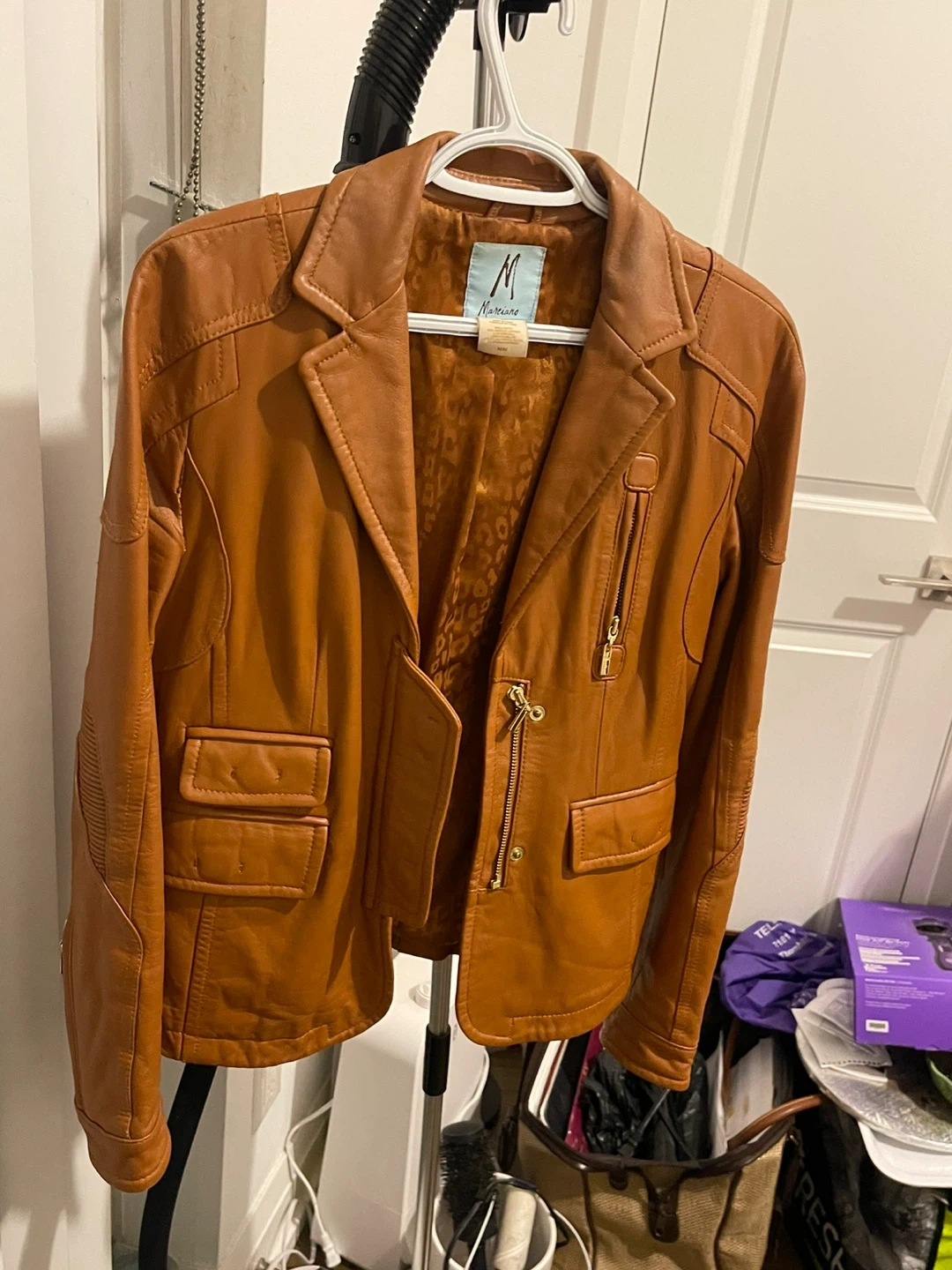 Stylish Guess by Marciano blazer made from genuine leather. It's a size medium with a unique leopard print lining. Perfect for layering over outfits for a chic look!