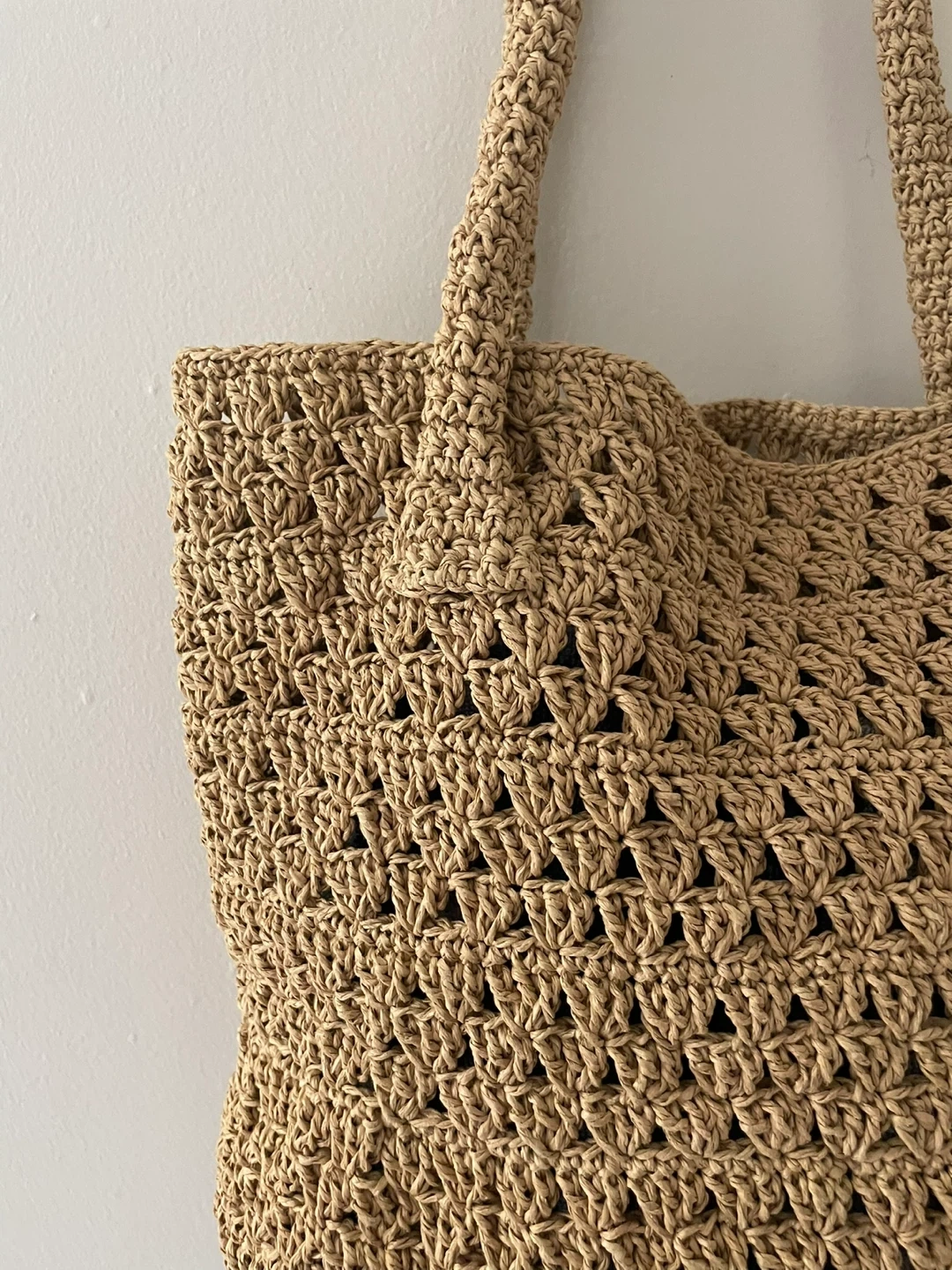 Handmade Light brown woven tote bag with braided handles. It's a stylish accessory for carrying your essentials. Made from straw-like material.