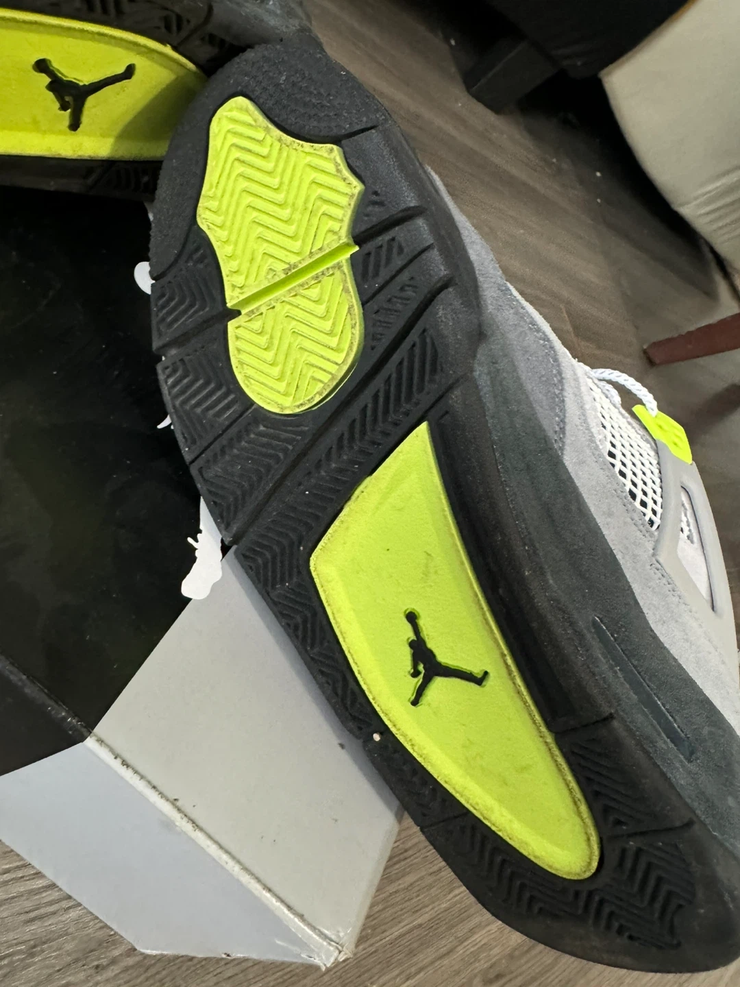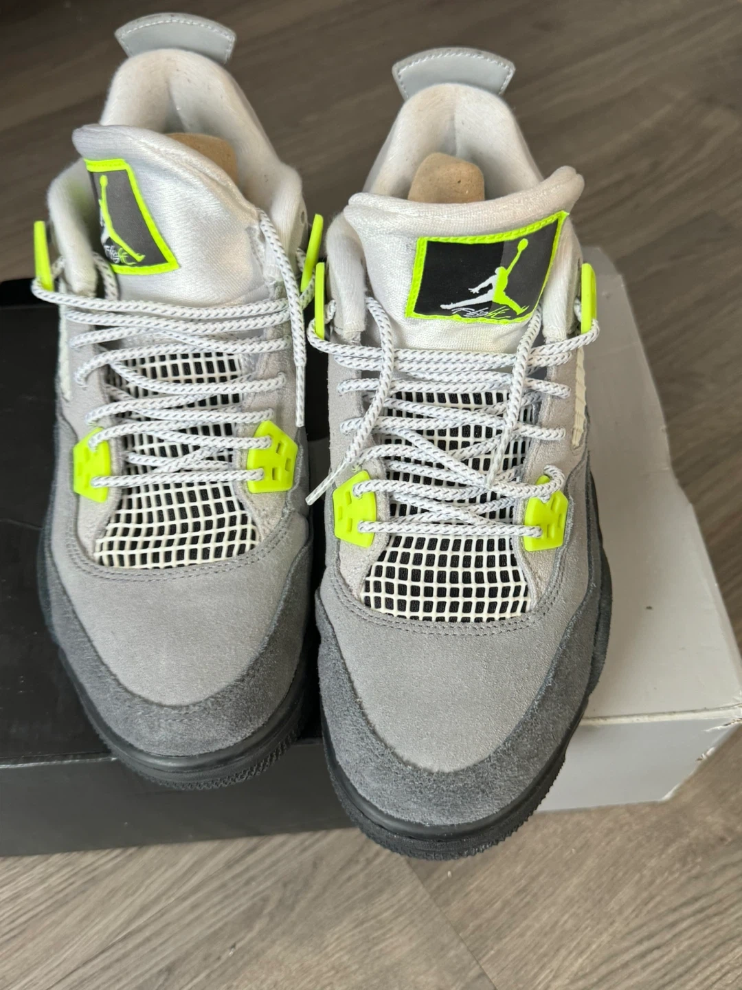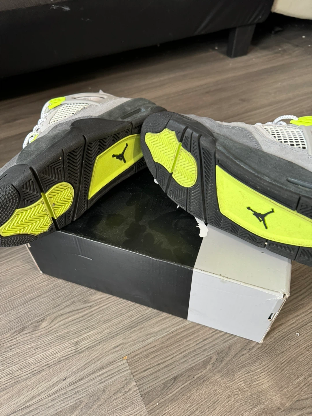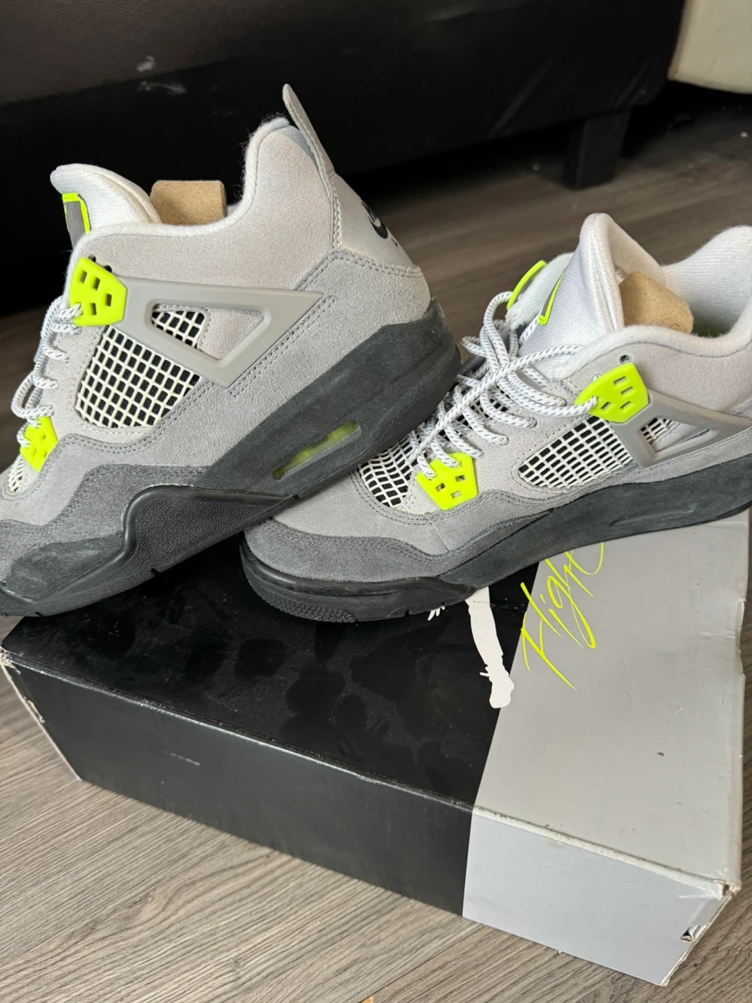 Air Jordan 4 Retro SE 2019 Grey suede and nubuck upper with neon yellow accents and black details. Features Jumpman logo on tongue and heel, and Nike Air cushioning. Comes with original box.