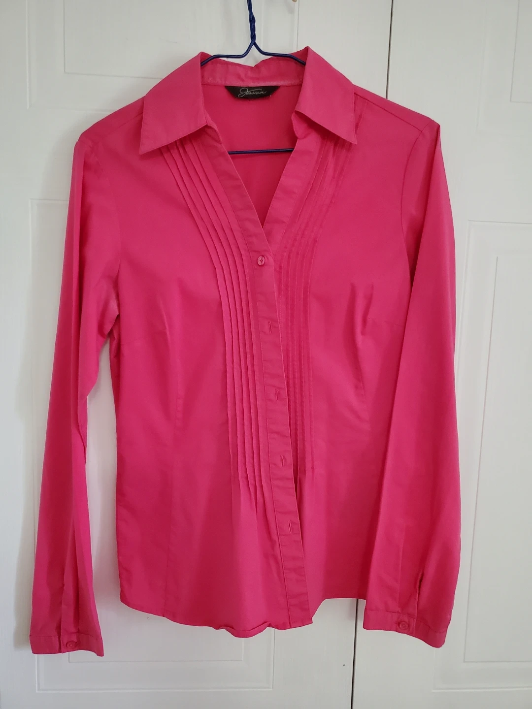 This Jessica blouse features a vibrant pink colour and a classic collared neckline. It's designed with elegant pintuck detailing down the front. Made for a stylish look!