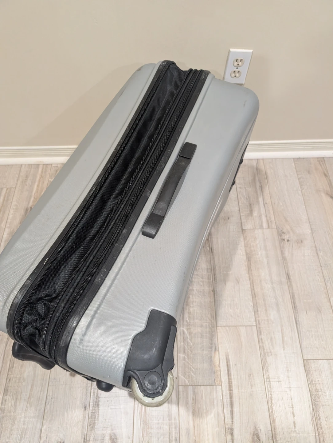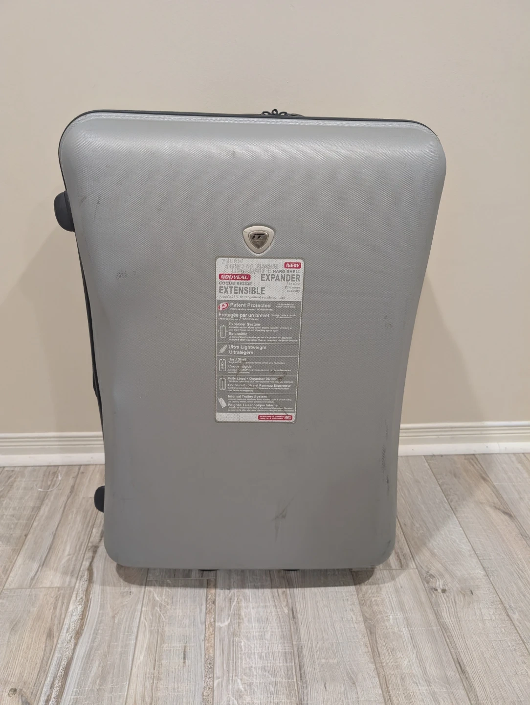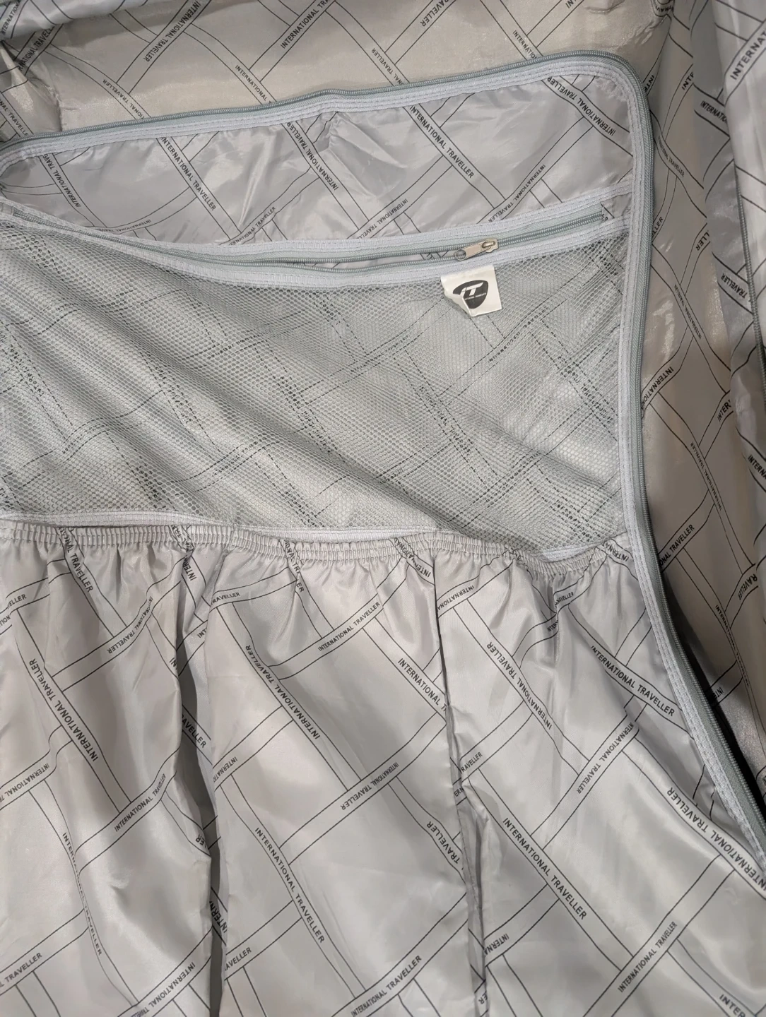 This is a grey International Traveller expandable suitcase. It's a durable piece of luggage with a telescoping handle and wheels for easy transport. Inside, there are tie-down straps and mesh pockets for organization.