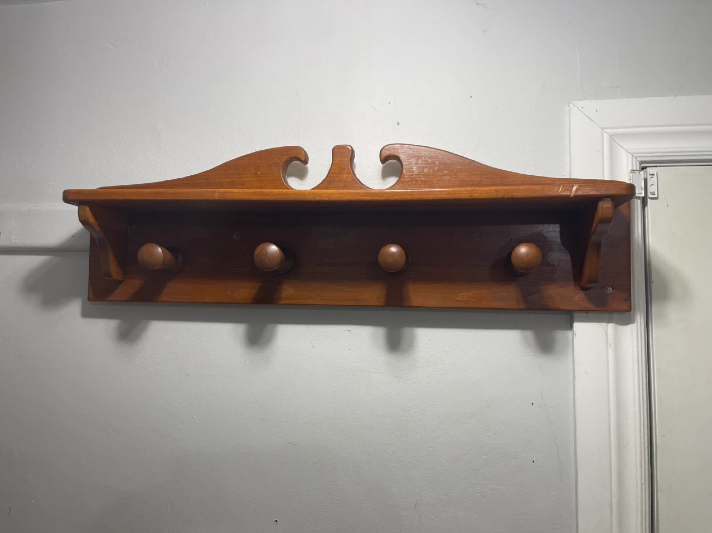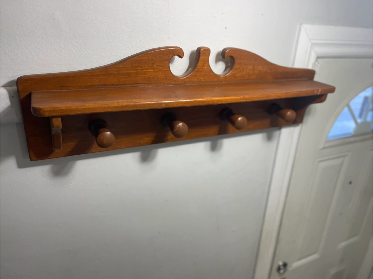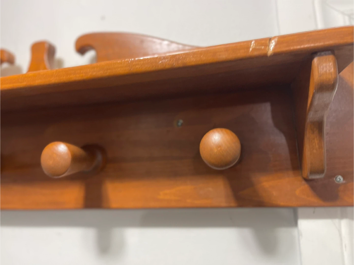 This wooden shelf features four round hooks for hanging items. It's made of solid wood with a warm, polished finish. Useful for organizing coats, keys, or hats by the door.