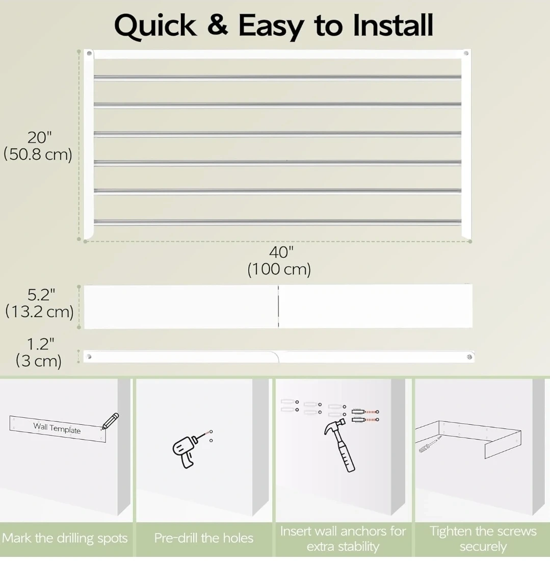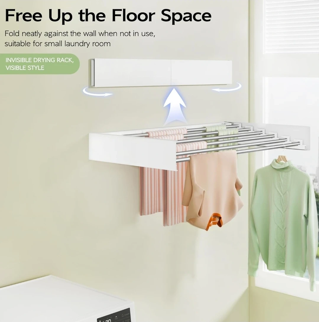 This wall-mounted clothes drying rack holds up to 60 pounds. It features thick stainless steel rods that won't sag, warp, or rust. It folds neatly against the wall when not in use, freeing up floor space. It's suitable for bathrooms, laundry rooms, or even outdoors!