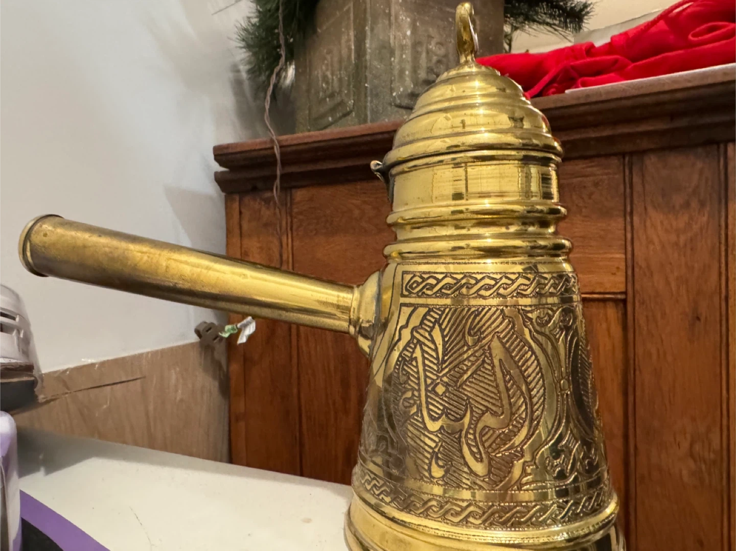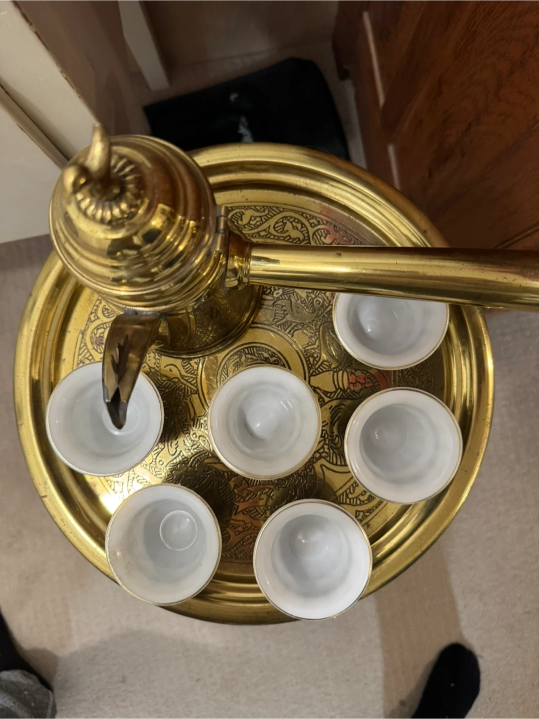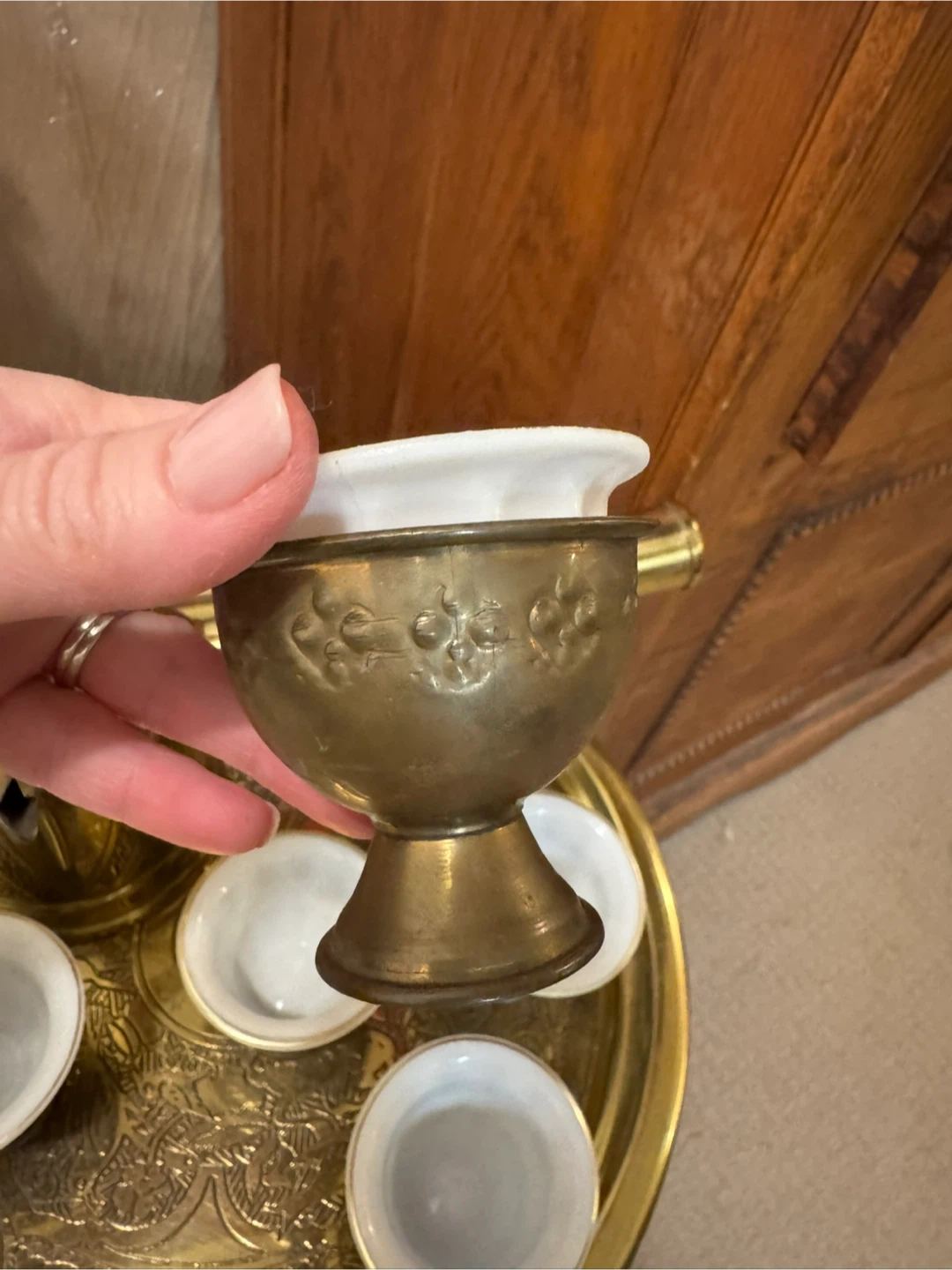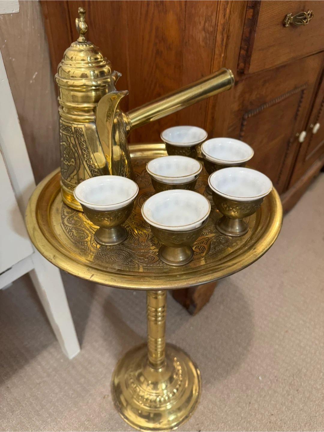 60Selling a beautiful brass tea set! Bought in Jerusalem in 1983 Iskandar Matar & Sons Nazareth Solid Brass Tray, Tea Pot And Cups With Inserts Comes With The Stand.