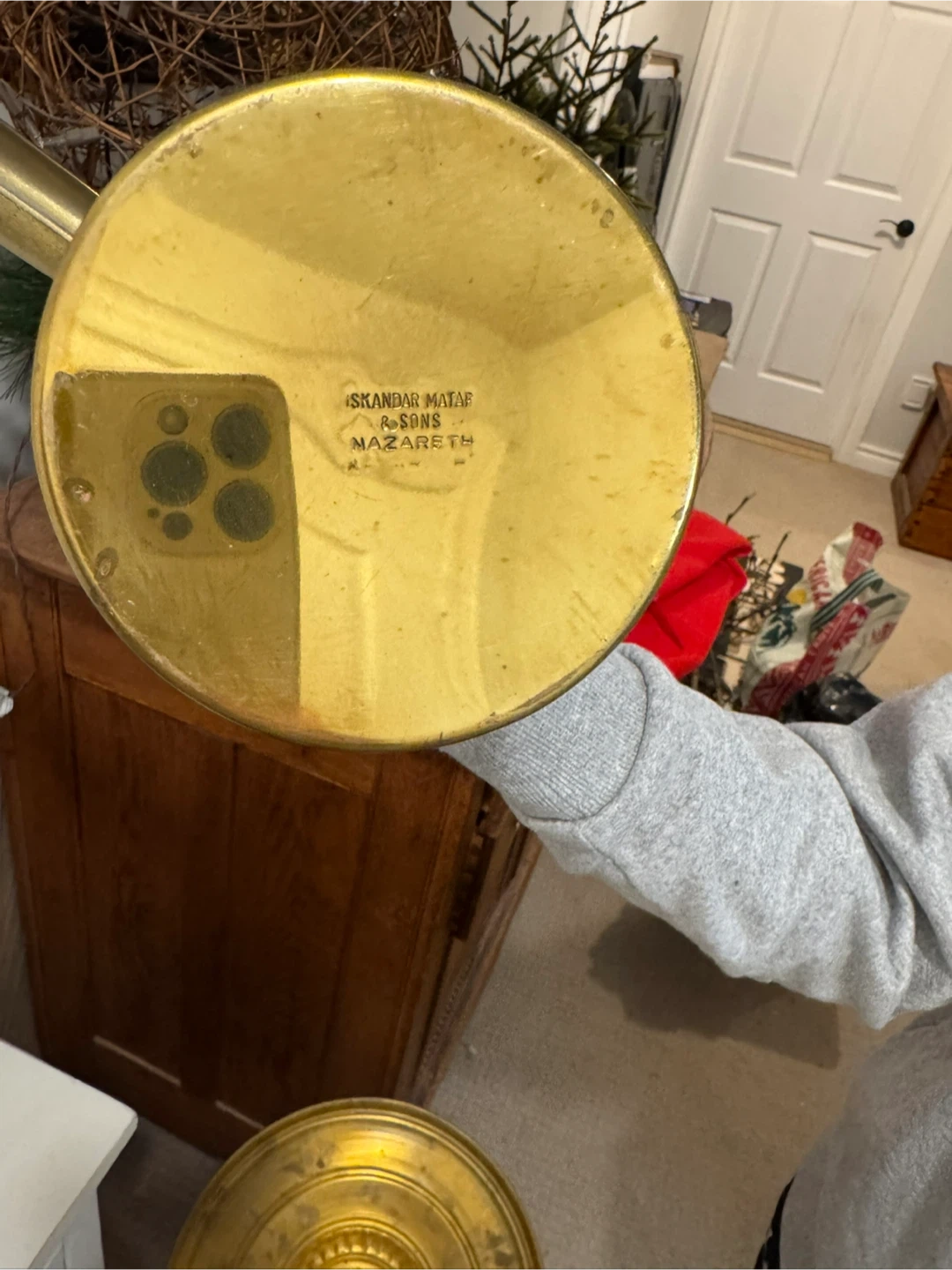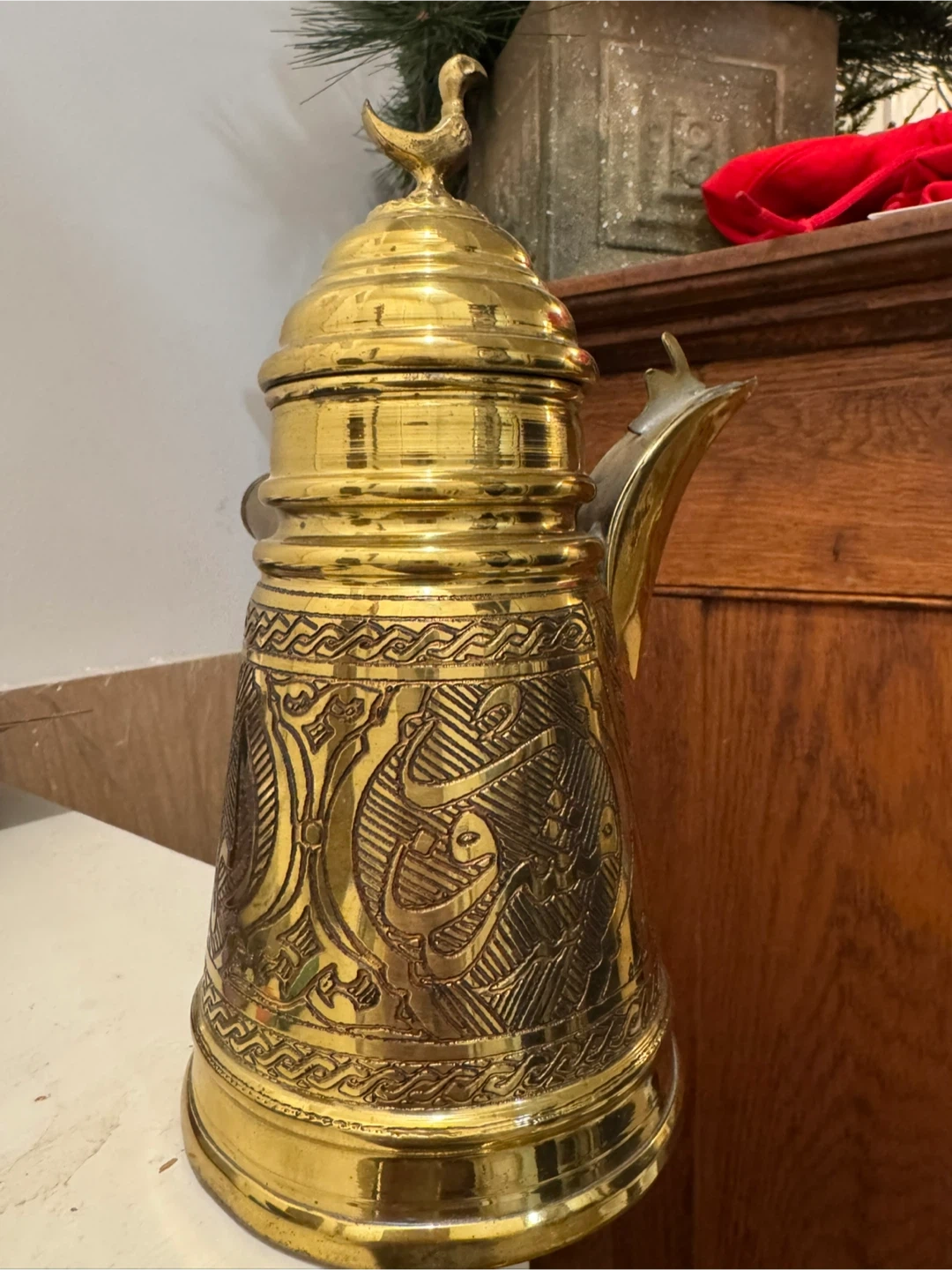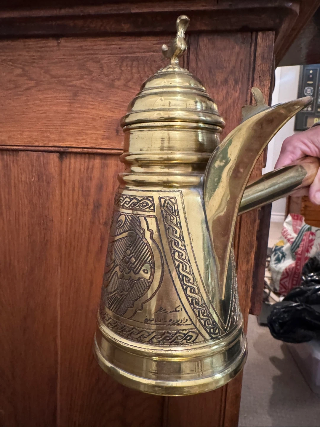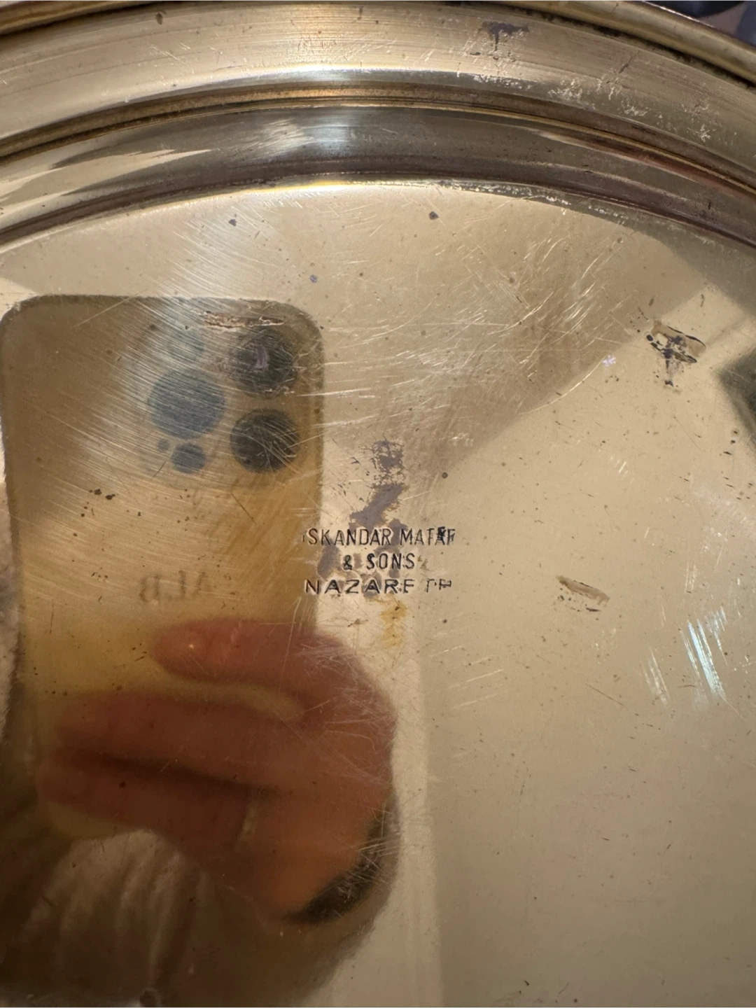 60Selling a beautiful brass tea set! Bought in Jerusalem in 1983 Iskandar Matar & Sons Nazareth Solid Brass Tray, Tea Pot And Cups With Inserts Comes With The Stand.