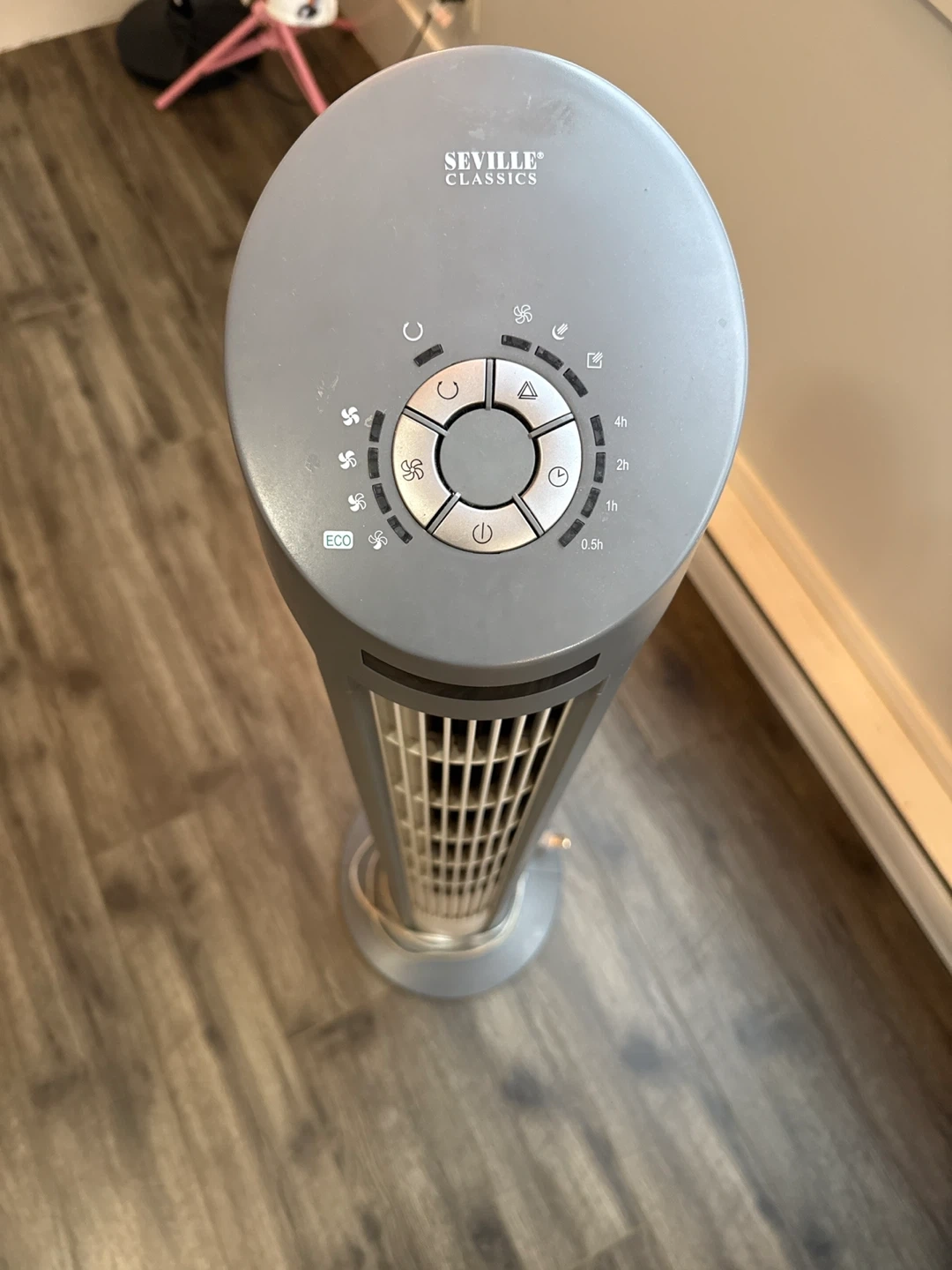Selling a Seville Classics tower fan! It's in great condition and ready to keep you cool. Features include multiple speed settings, an ECO mode, and a timer function for 0.5, 1, 2, or 4 hours