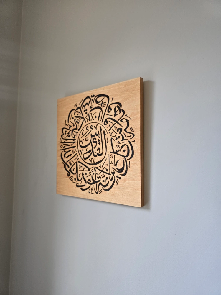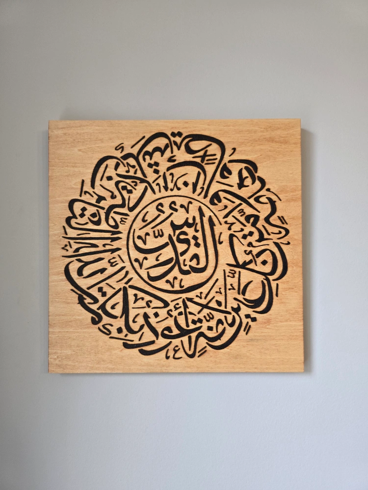 Beautiful Islamic calligraphy art piece on wood. This unique piece would add a touch of elegance to any room. The intricate design and natural wood grain make it a lovely addition to your home decor. Handcrafted, hand burned on a 12x12" wood canvas. Stained in golden pecan. Free delivery within Calgary SE/NE and Chestermere.