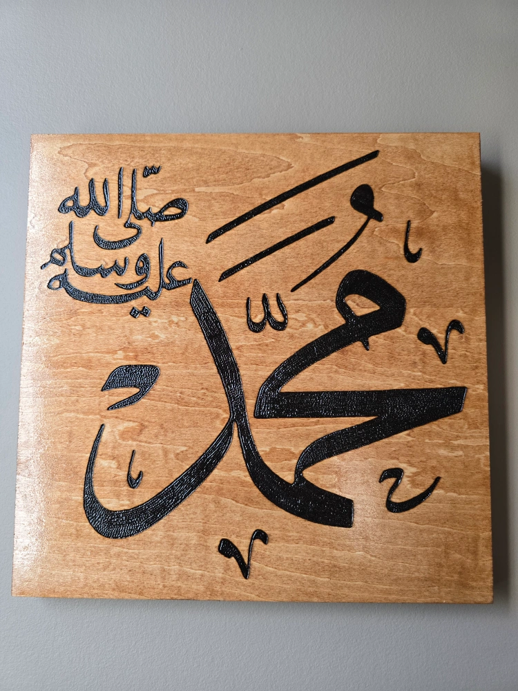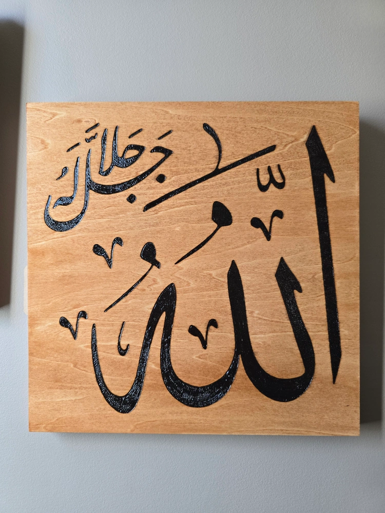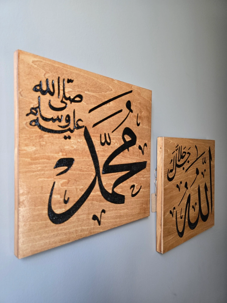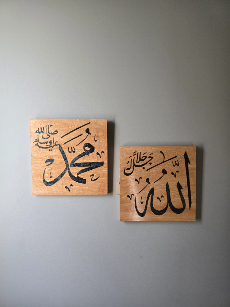 Beautiful set of two wooden wall art pieces featuring Islamic calligraphy. Adds a unique touch to any room! Handcrafted, hand burned on a 12x12" wood canvas. stained in traditional cherry and finished with a polyurethane clear gloss. Free delivery within Calgary SE/NE and Chestermere.