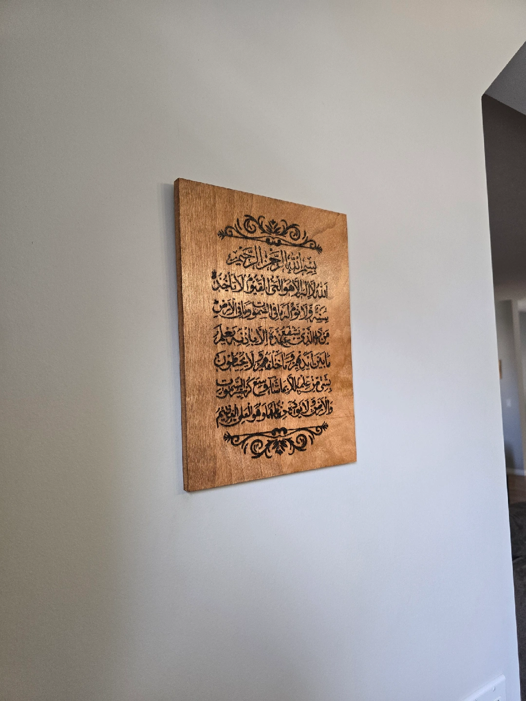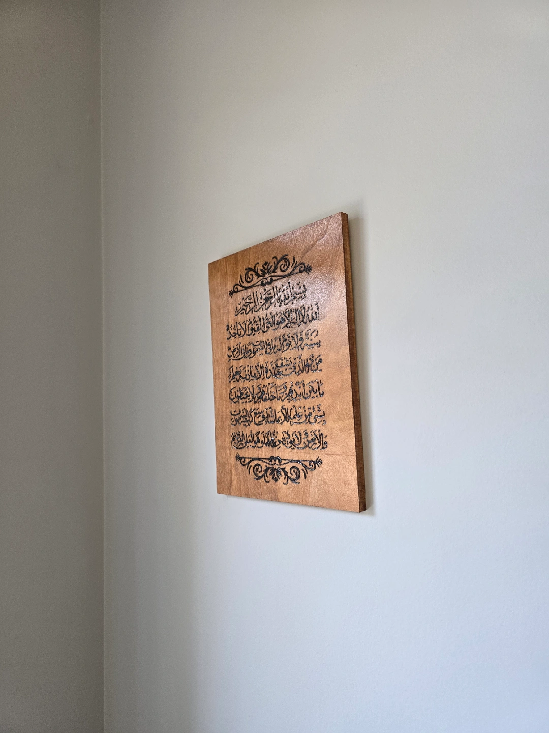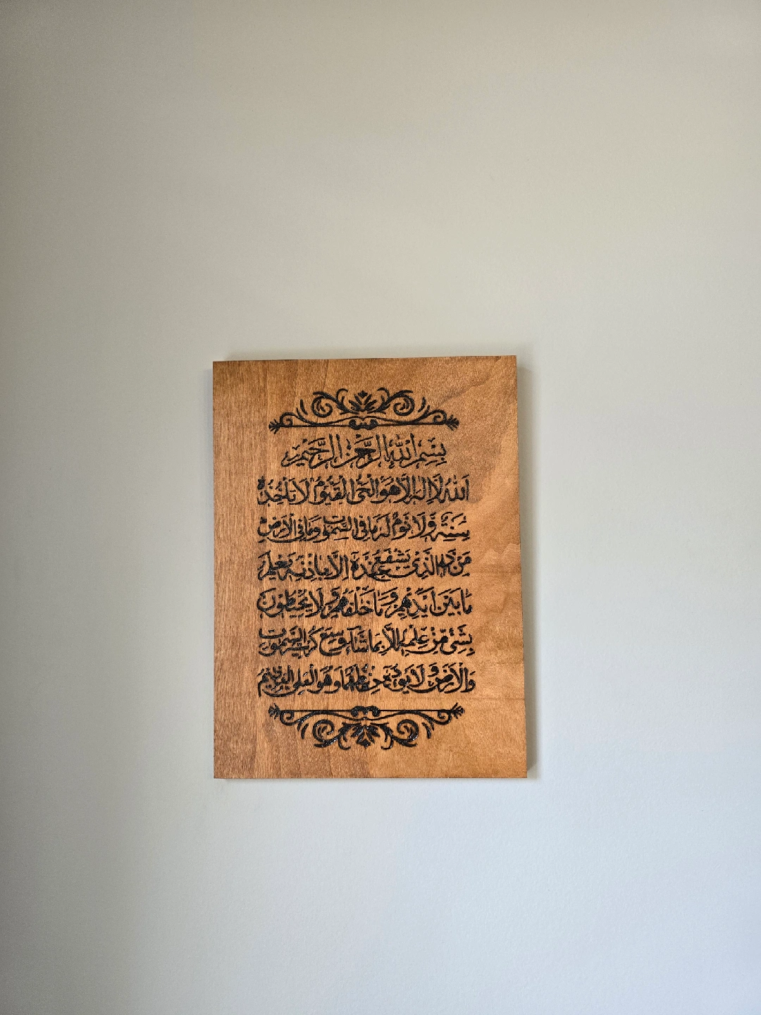 Handcrafted, handburnt ayatul Kursi on a 9x12" wood canvas. stained in traditional cherry and finished with clear gloss. Free delivery within Calgary SE/NE and Chestermere.