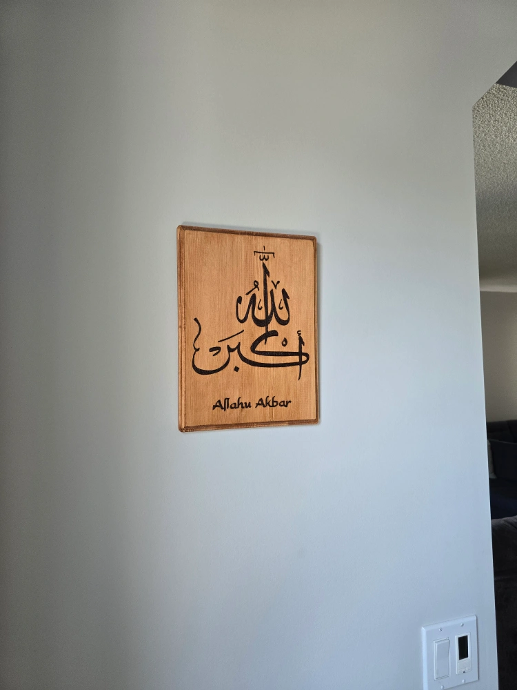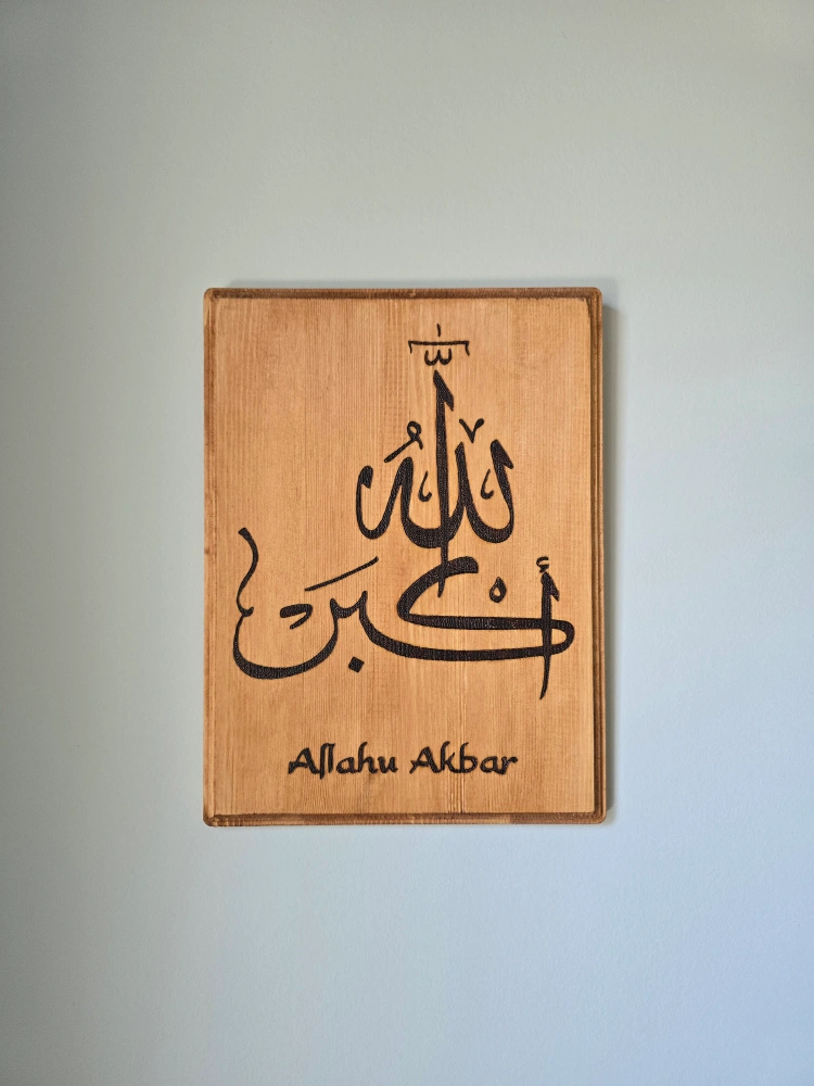 A beautiful piece of wood art featuring the phrase "Allahu Akbar" in Arabic calligraphy. It's a lovely addition to any home decor. handcrafted, hand burned on a 9x12" wood plaque. stained in traditional cherry Free delivery within Calgary SE/NE and Chestermere.