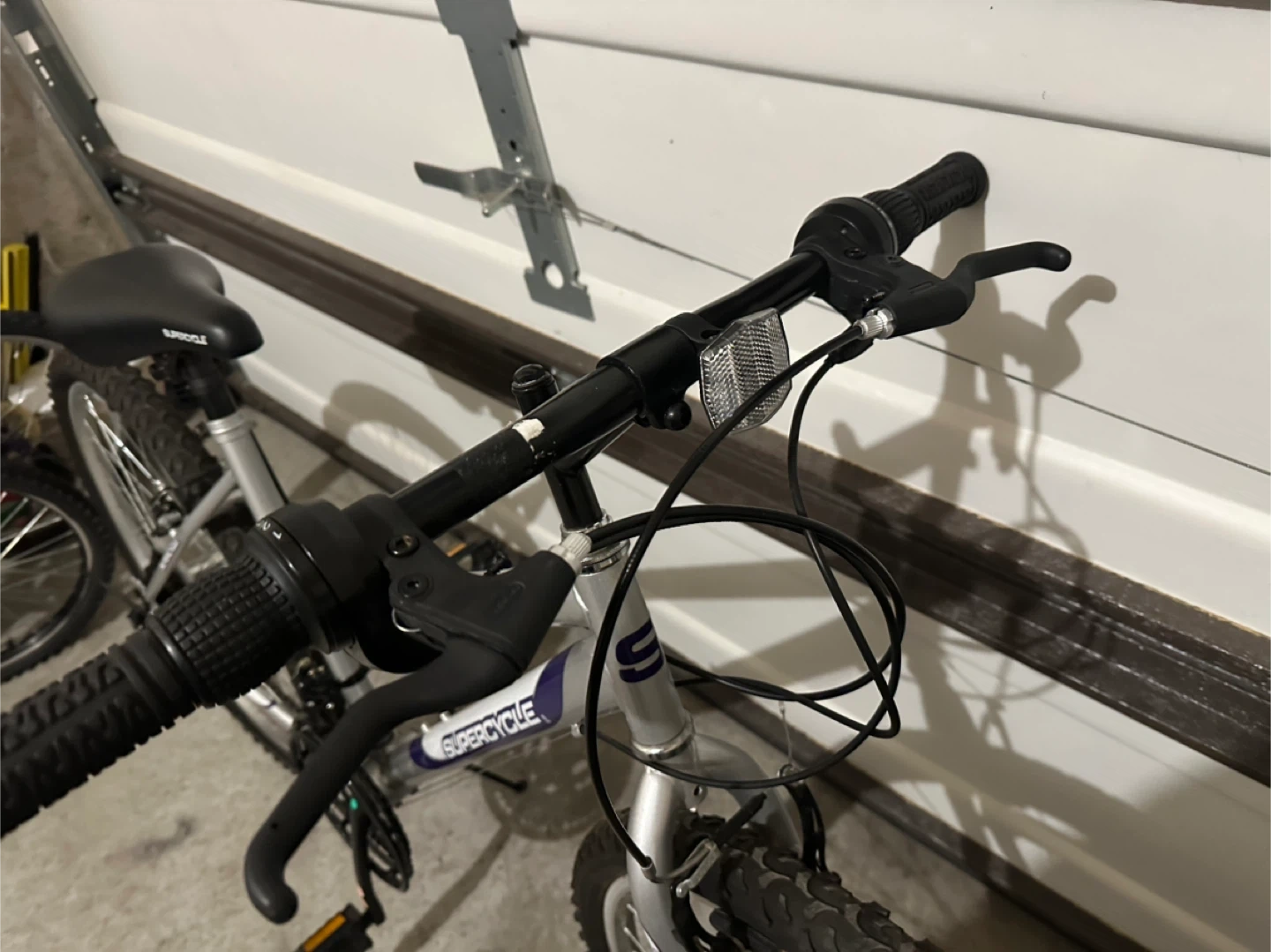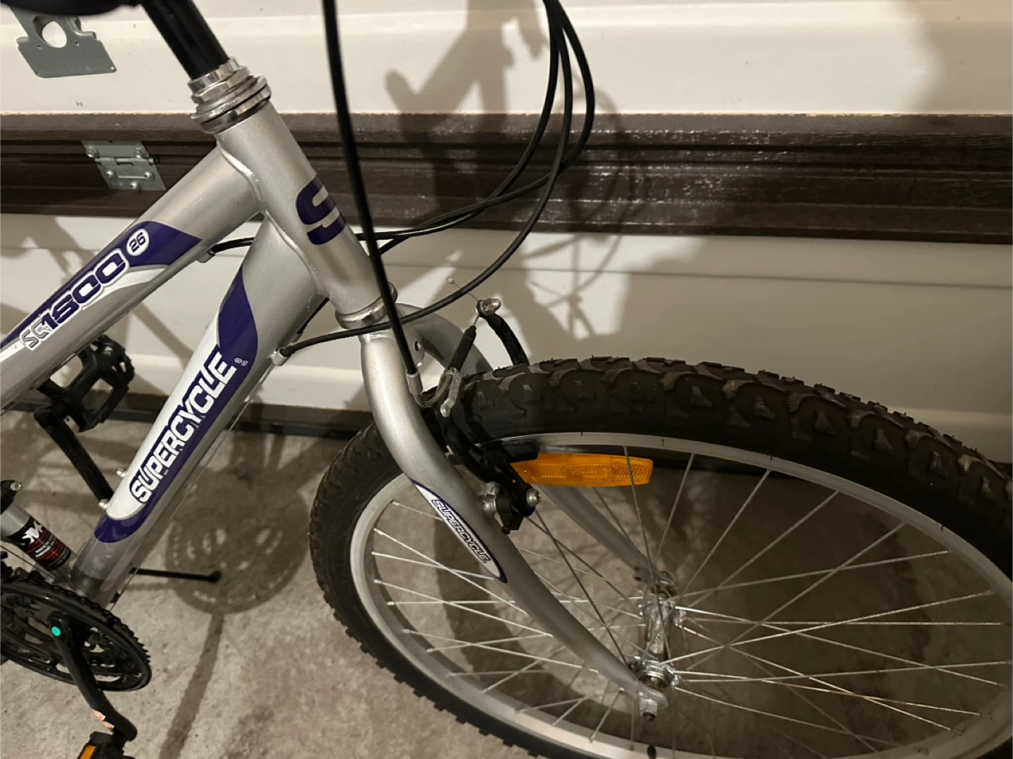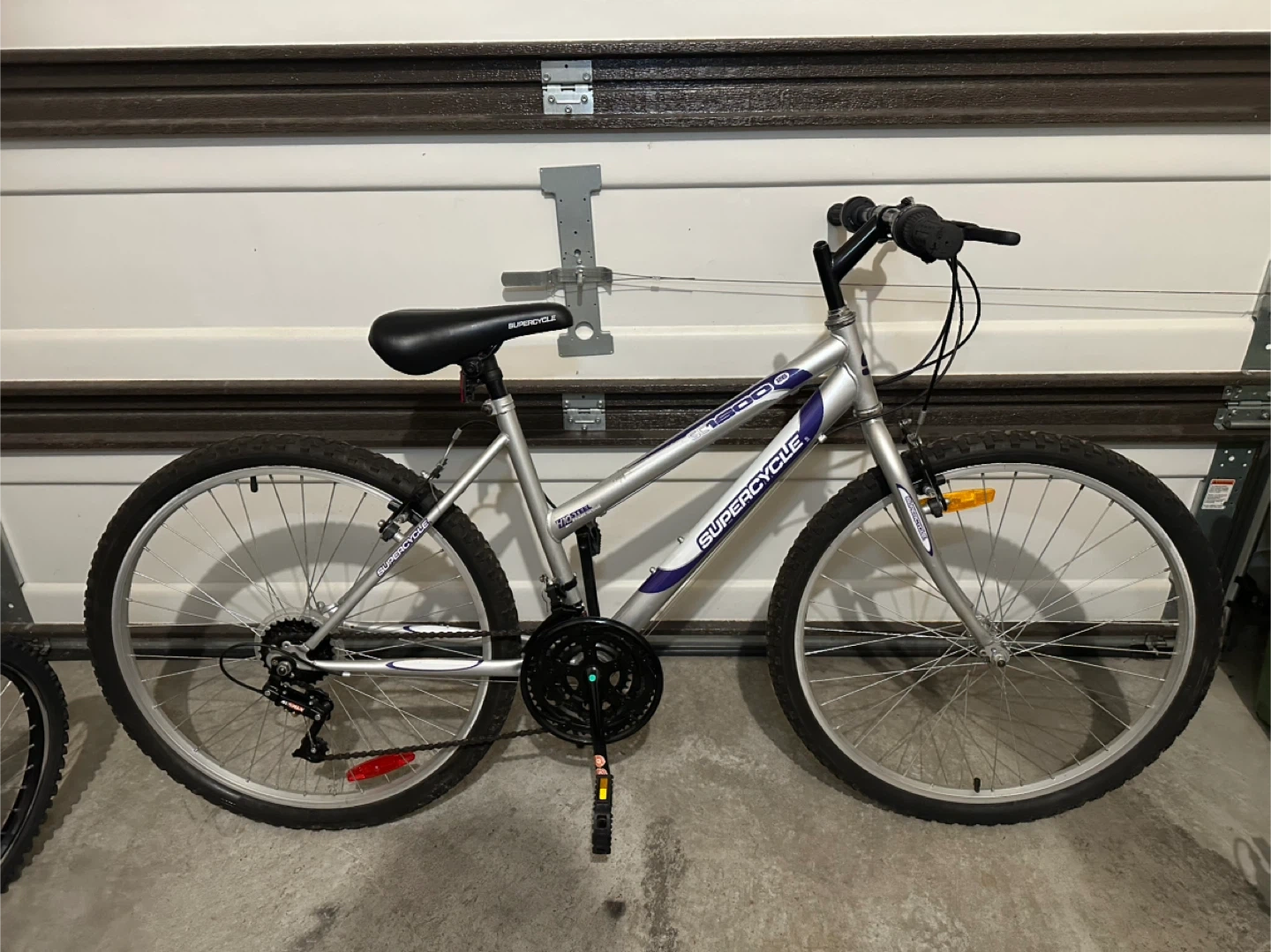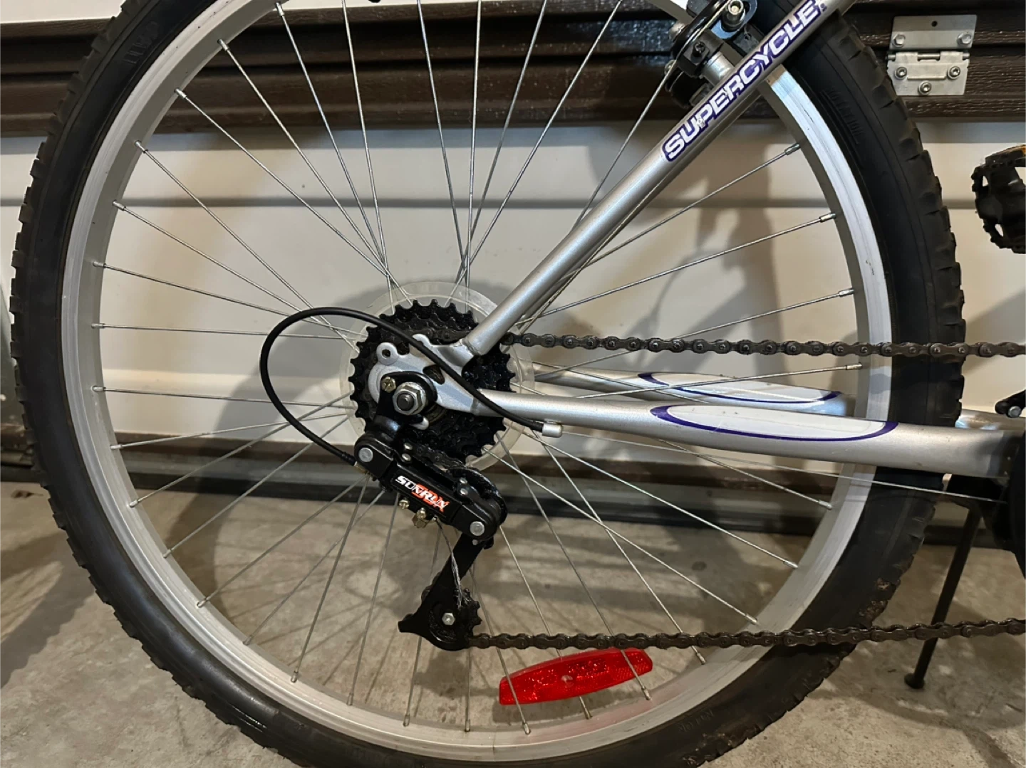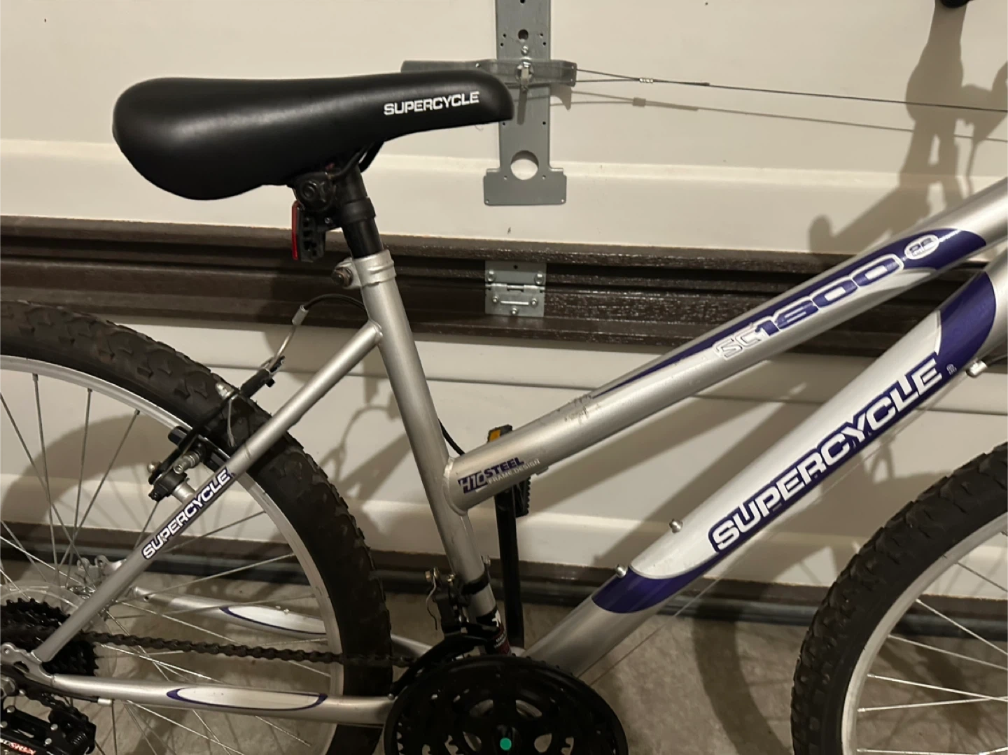 This is a silver Supercycle SC1600 mountain bike with 26-inch wheels. It features a hi-tensile steel frame and a Shimano derailleur. It's great for riding on trails or around town!