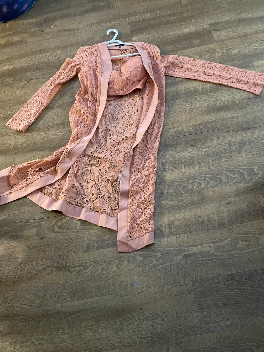 This set includes wide leg pants and a matching lace duster. The fabric is a detailed lace in a pretty pink shade. It's a stylish outfit for a night out!
