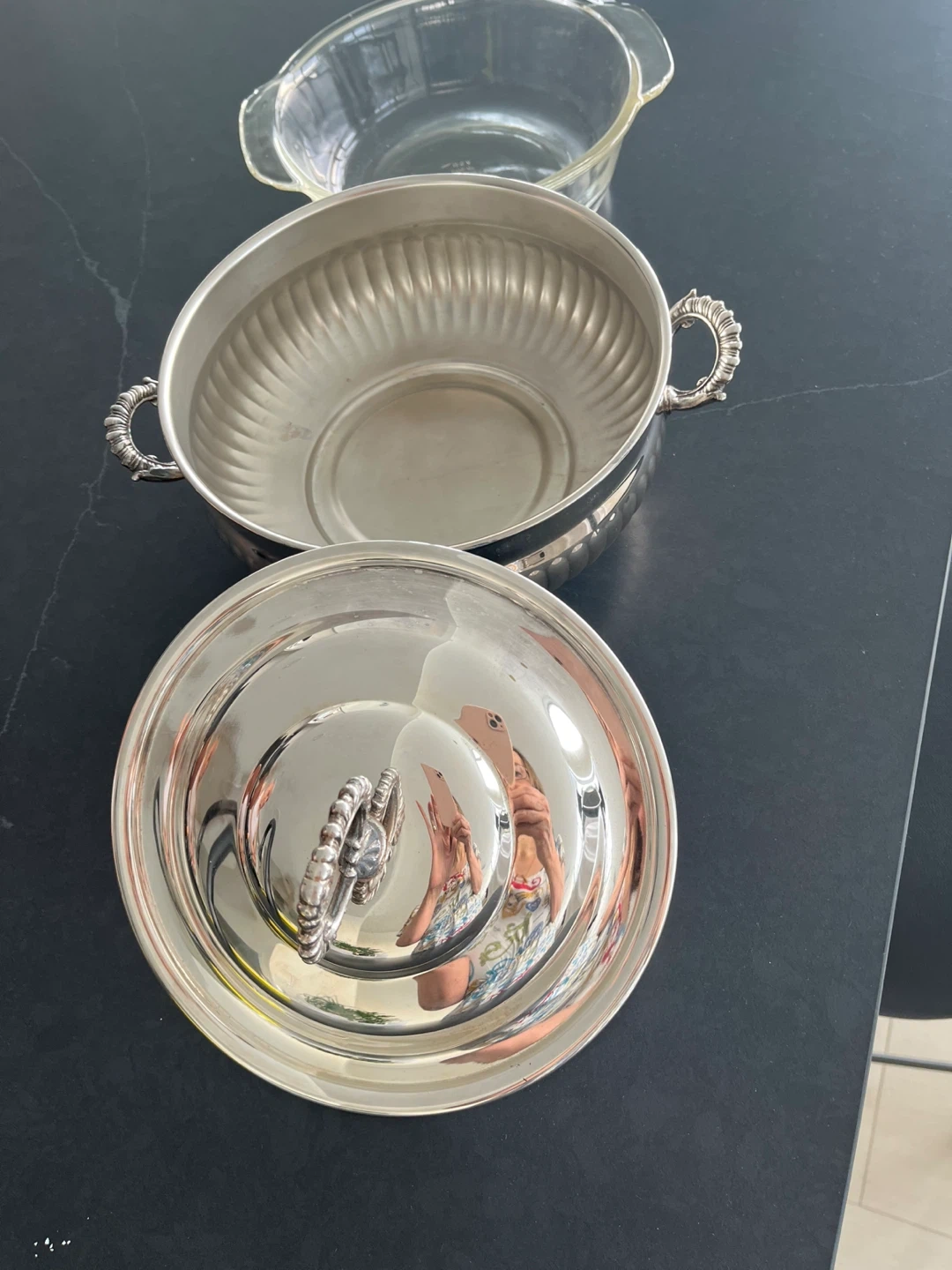 Elegant silver-plated serving dish with a clear glass insert and lid. Features ornate handles and knob. This dish is great for keeping food warm and serving meals at gatherings.