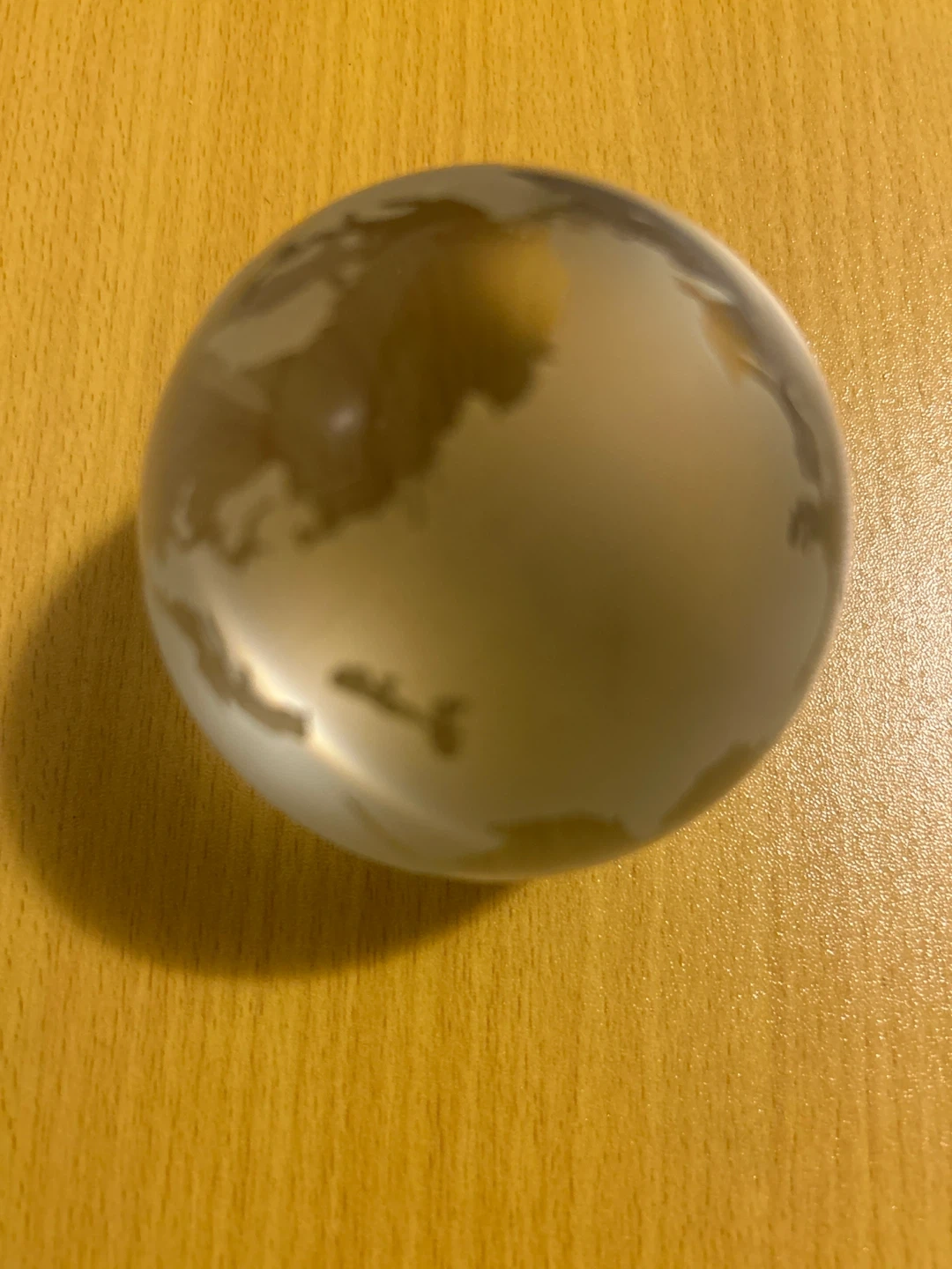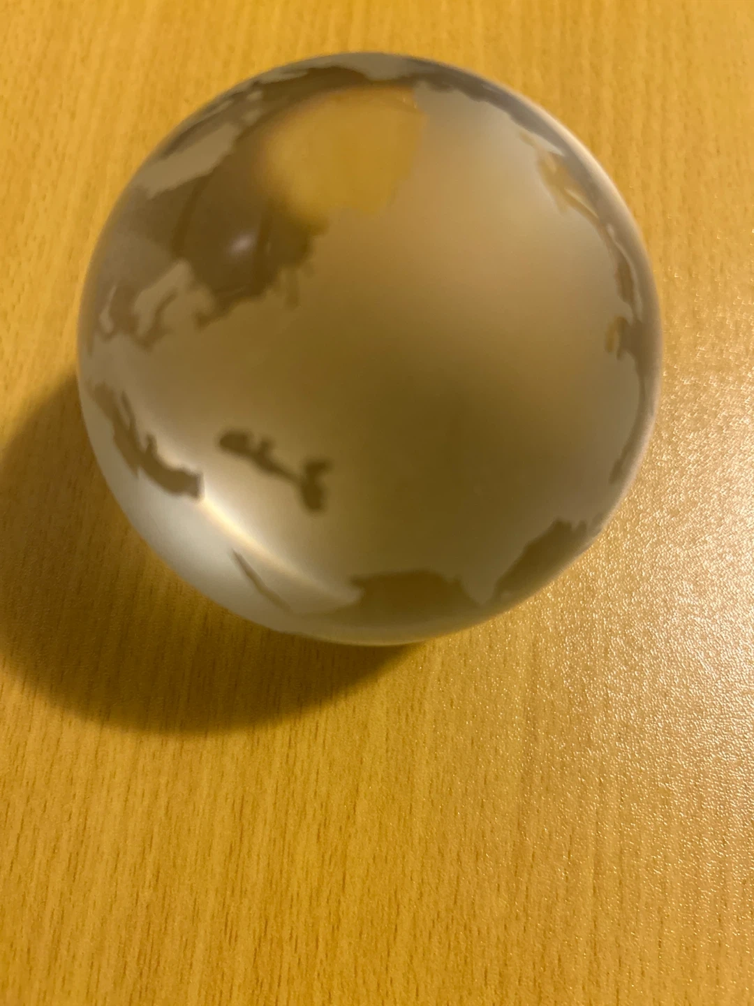 Decorative glass globe featuring a world map etched onto its surface. Made of clear glass with frosted continents. Adds a touch of sophistication to any desk.