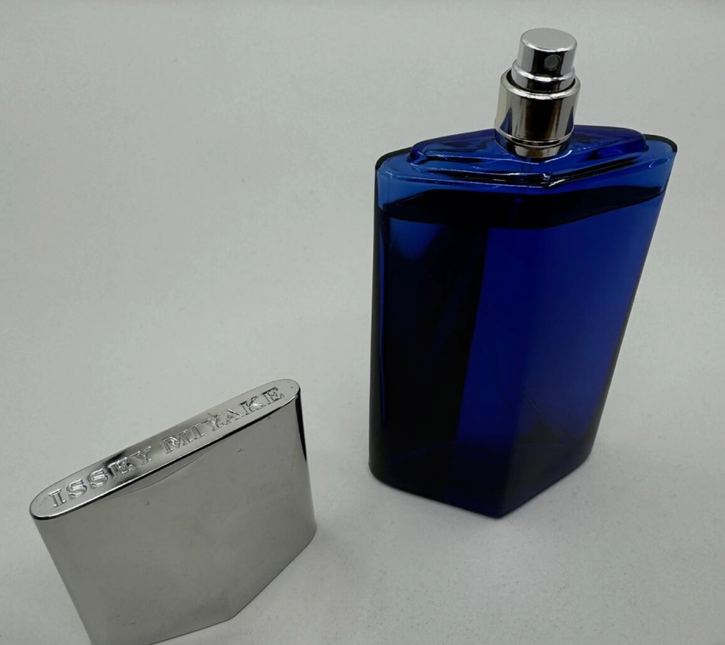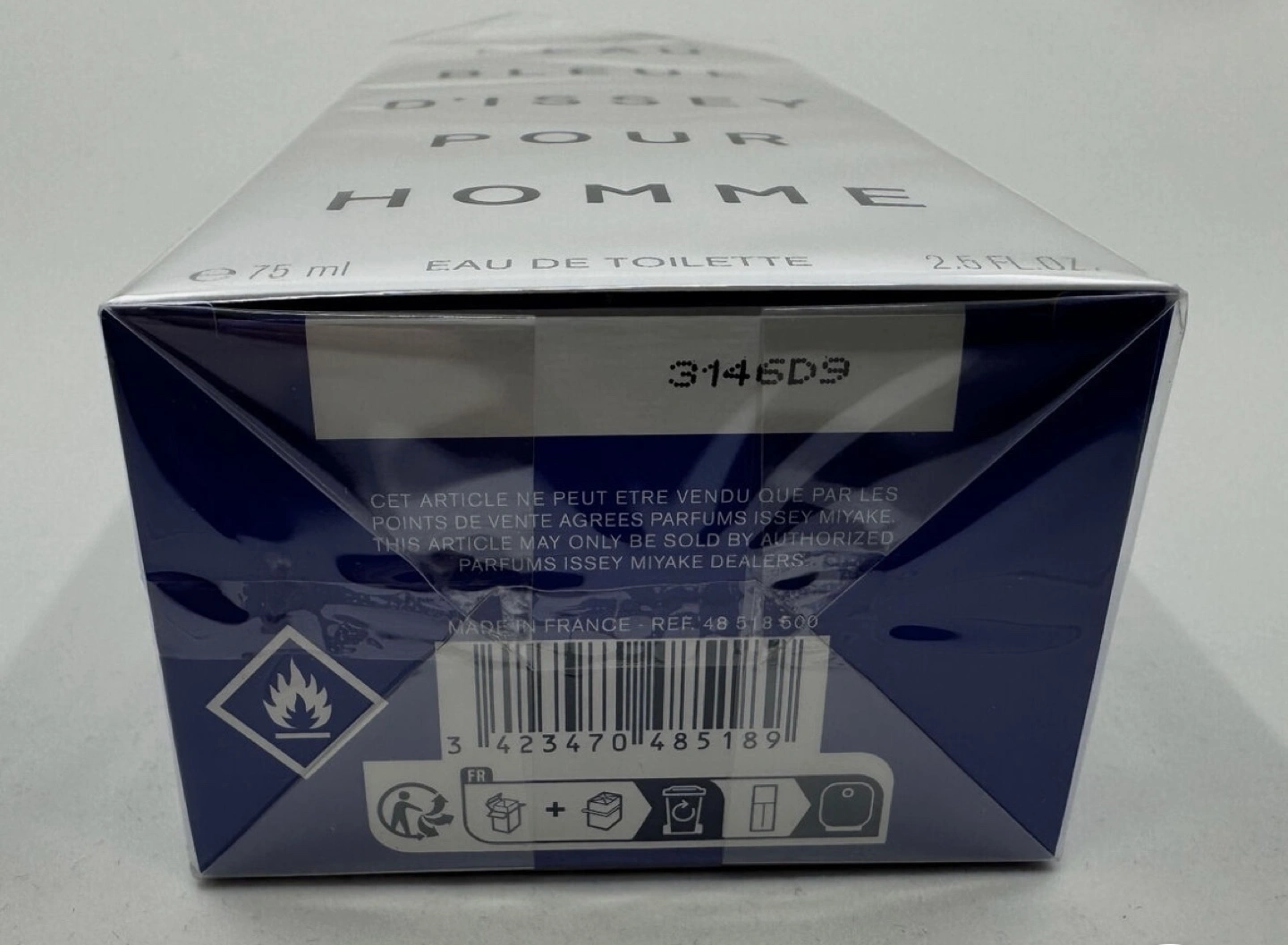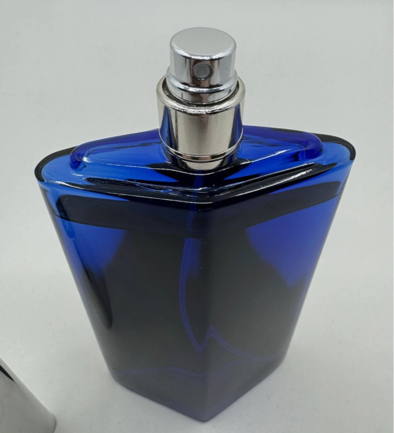 Never used, Eau de Toilette spray. 75ml bottle. Unique cobalt blue glass bottle. Silver-toned cap and box.
