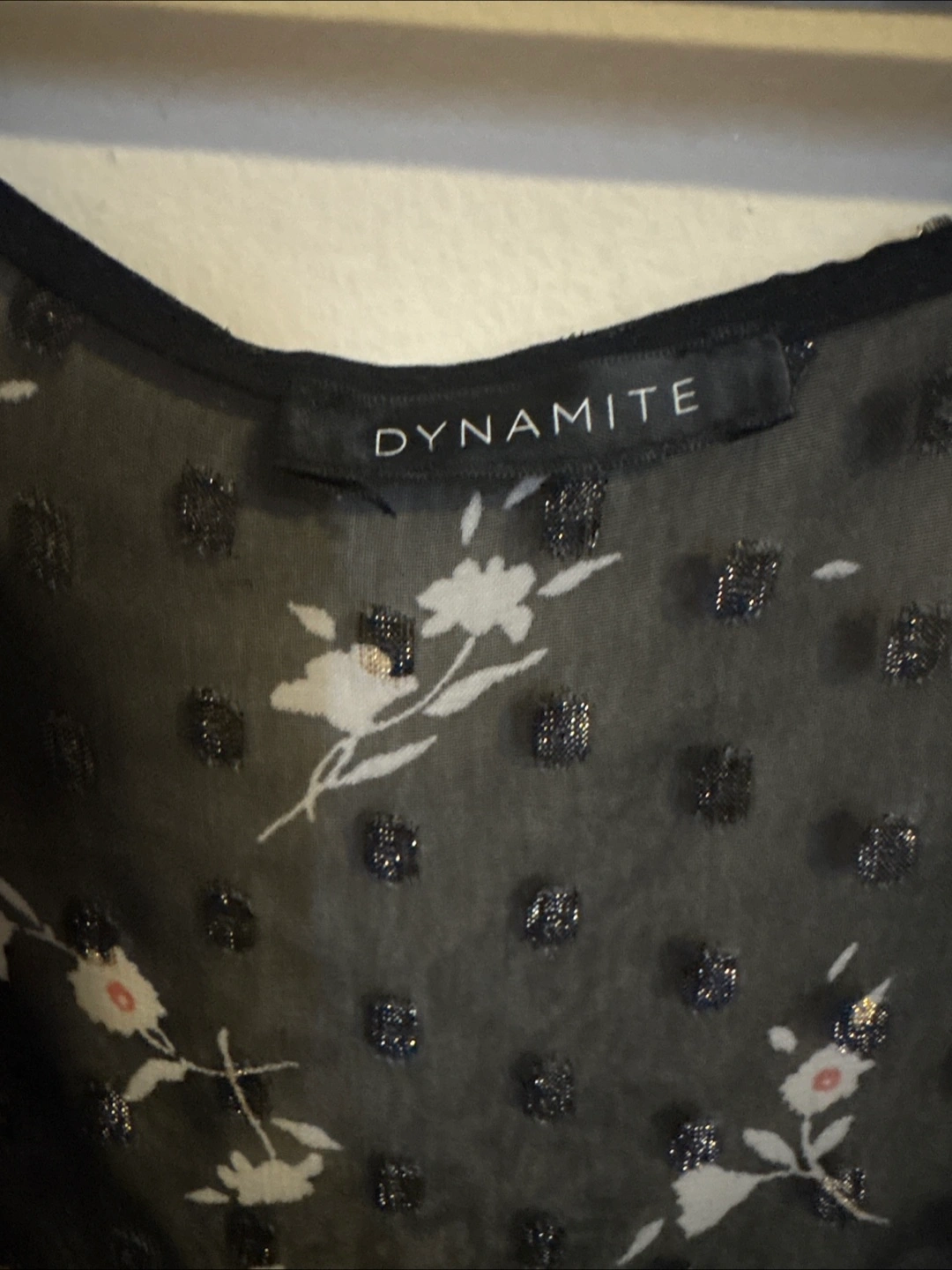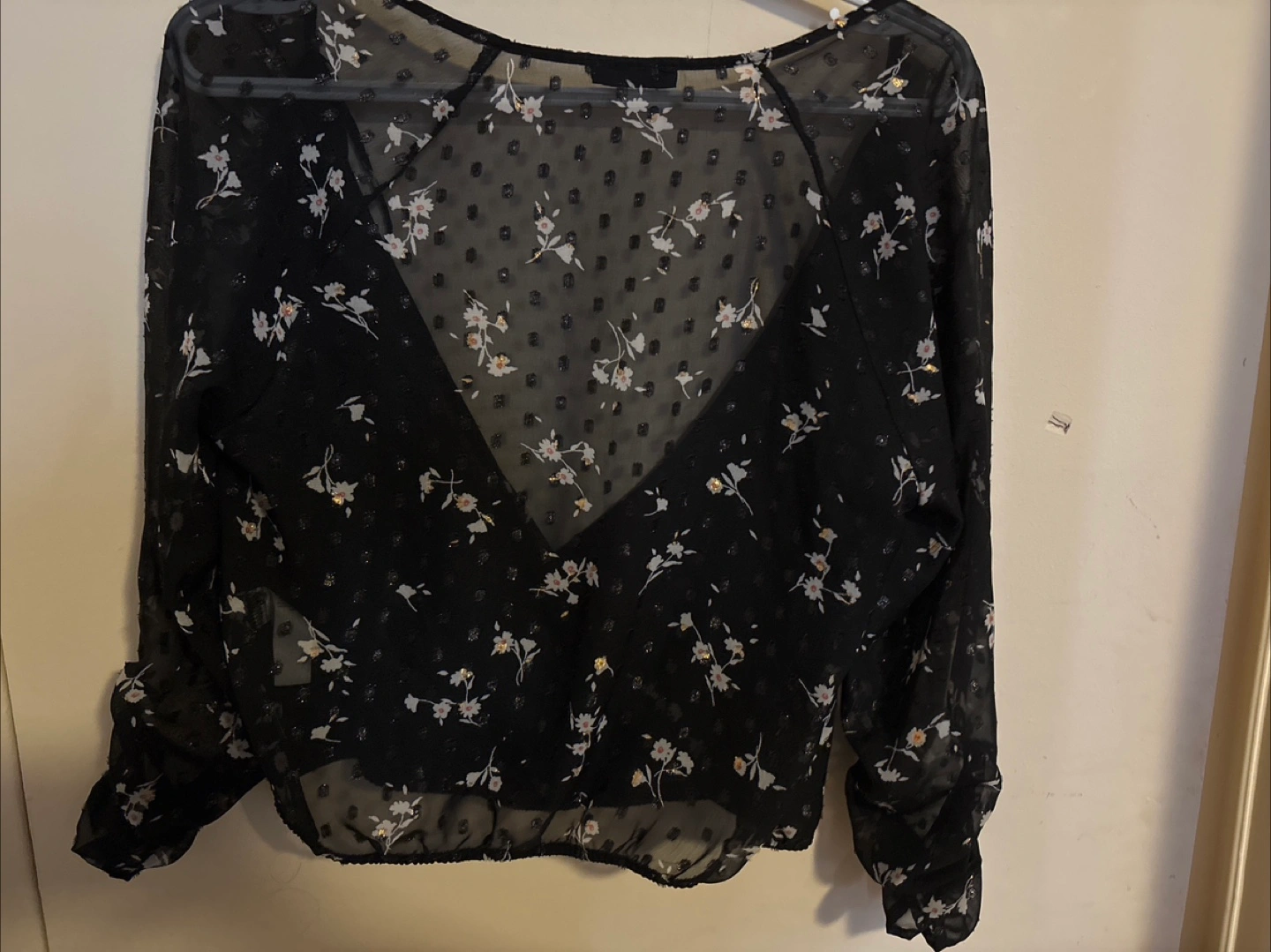 Selling a cute floral print blouse from Dynamite! It's a sheer black material with a wrap-style front. Perfect for dressing up or down!