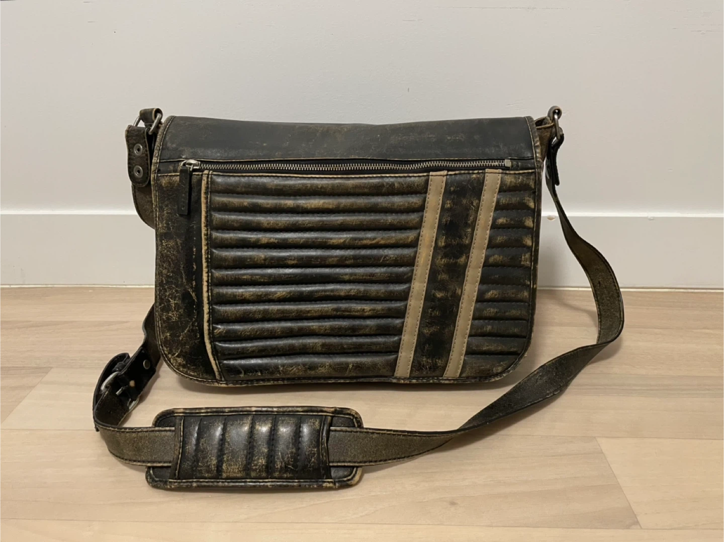 Long leather shoulder strap (1.25" wide) with belt buckle to adjust length.