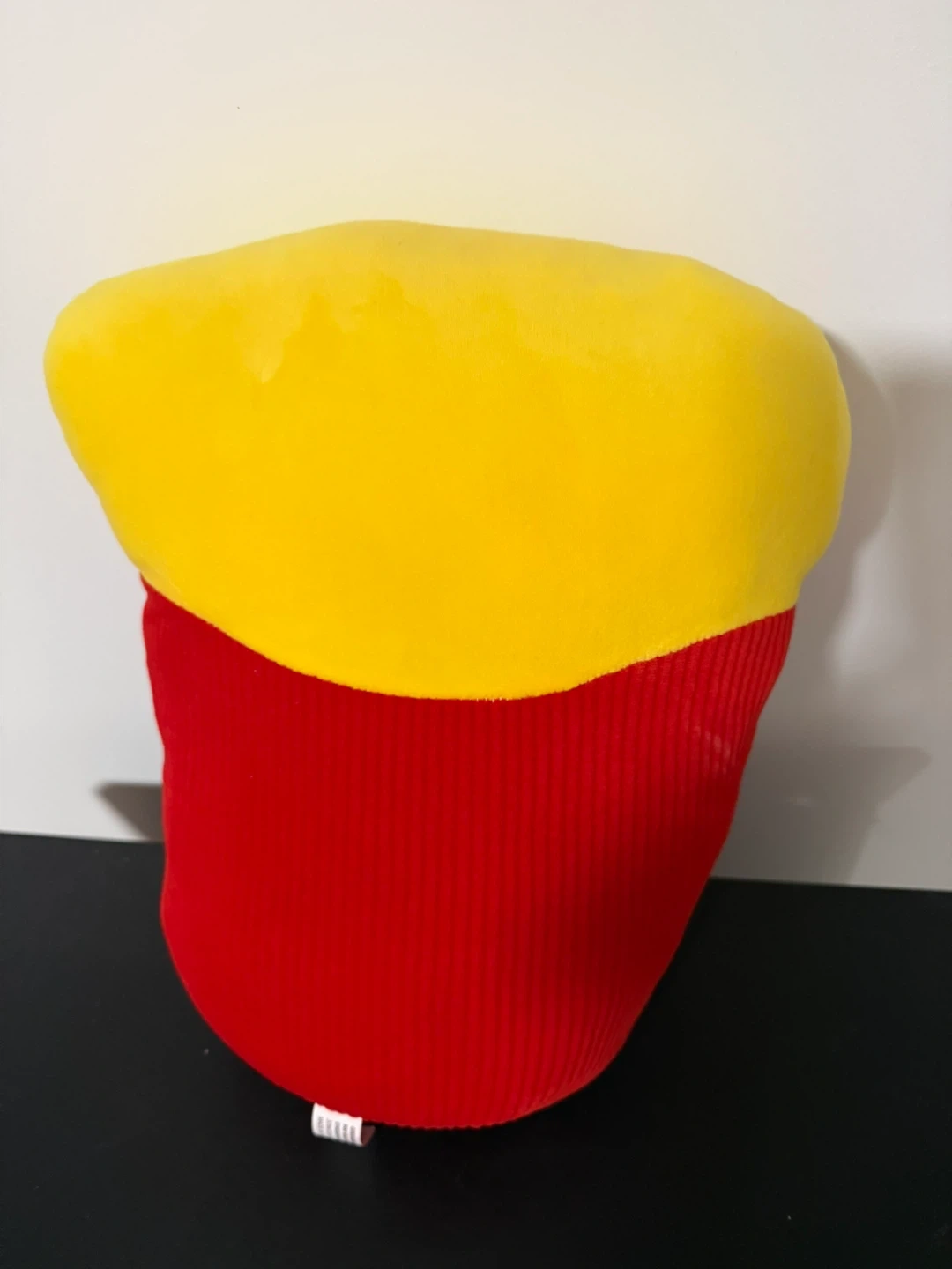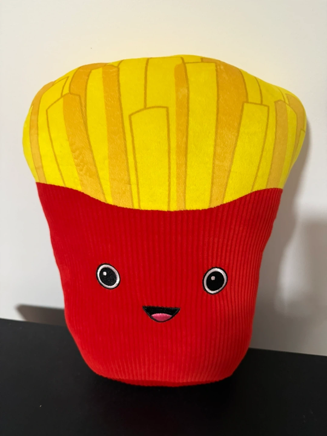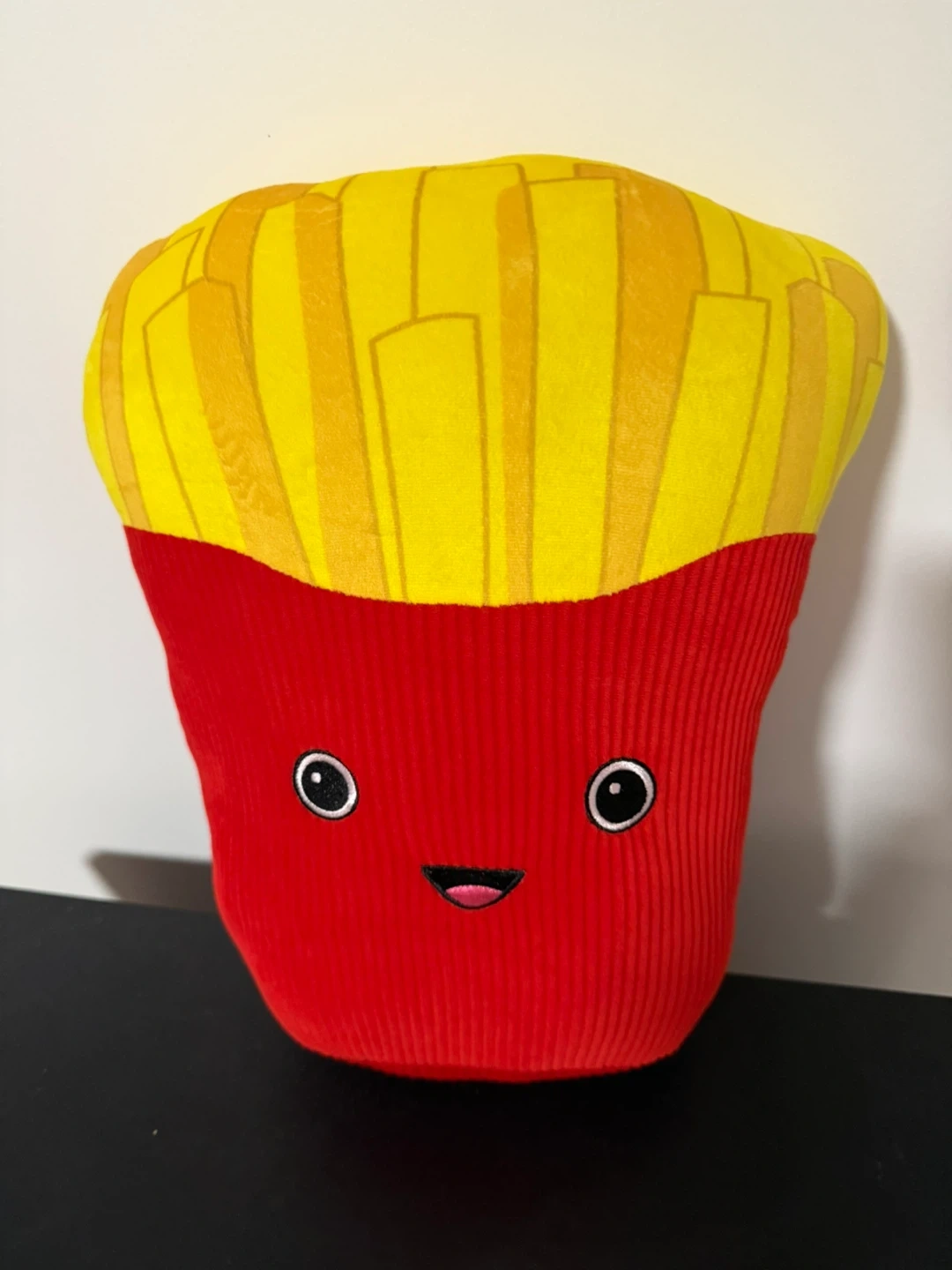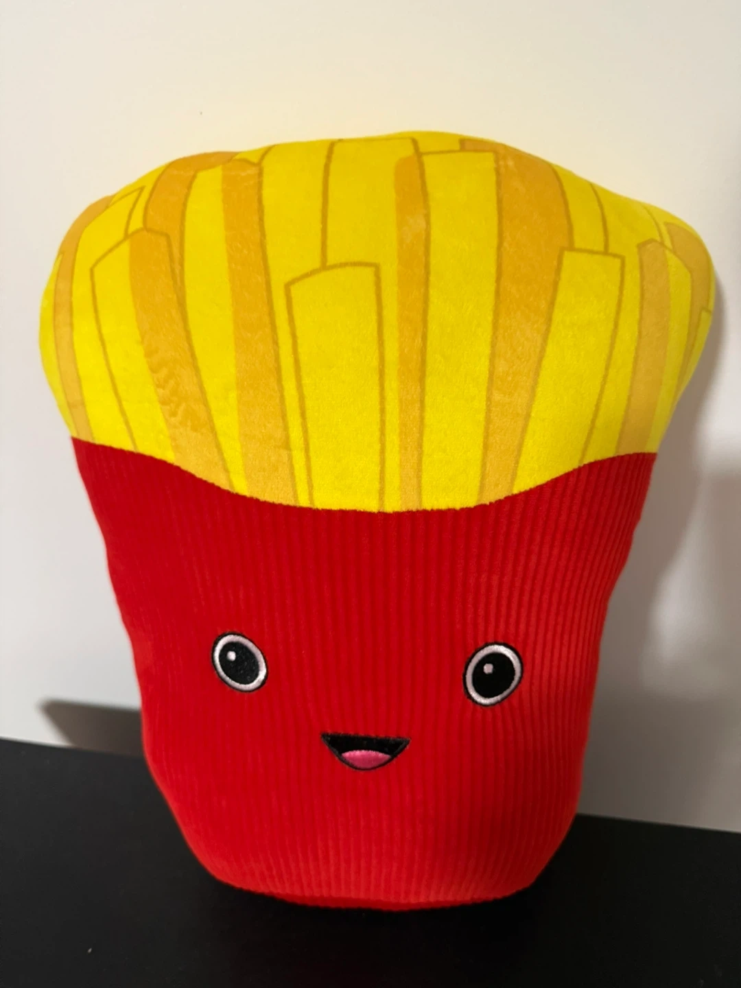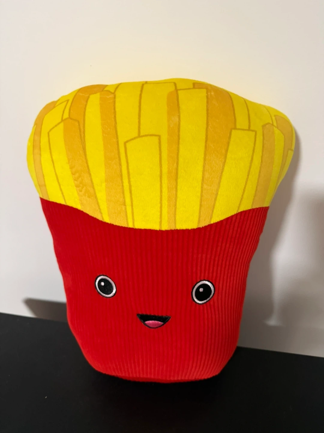 This is a fun and cuddly plush pillow designed to look like a carton of french fries. It features a smiling face and soft corduroy-like material on the red portion. It's a great decorative item for a couch or bed!