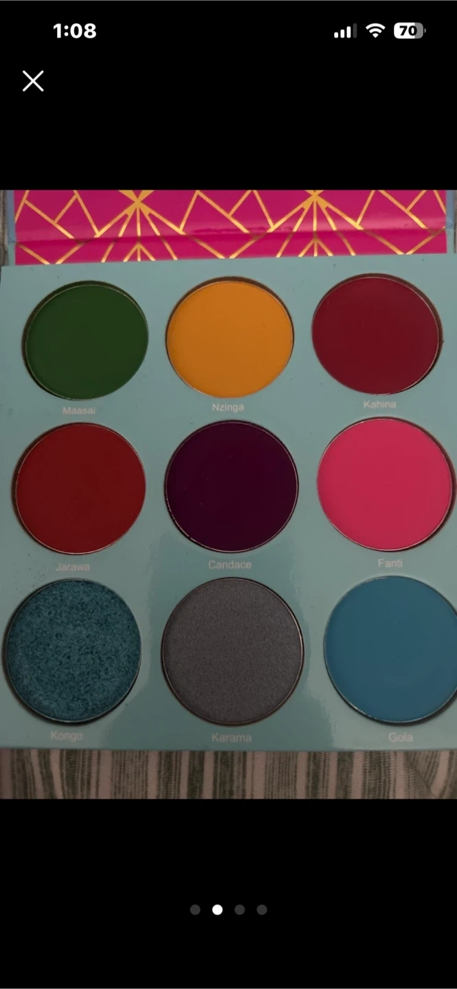 This Juvia's Place eyeshadow palette features nine vibrant shades. It's a pressed pigment palette designed and formulated in the USA. The shades offer a range of colours for various looks.
