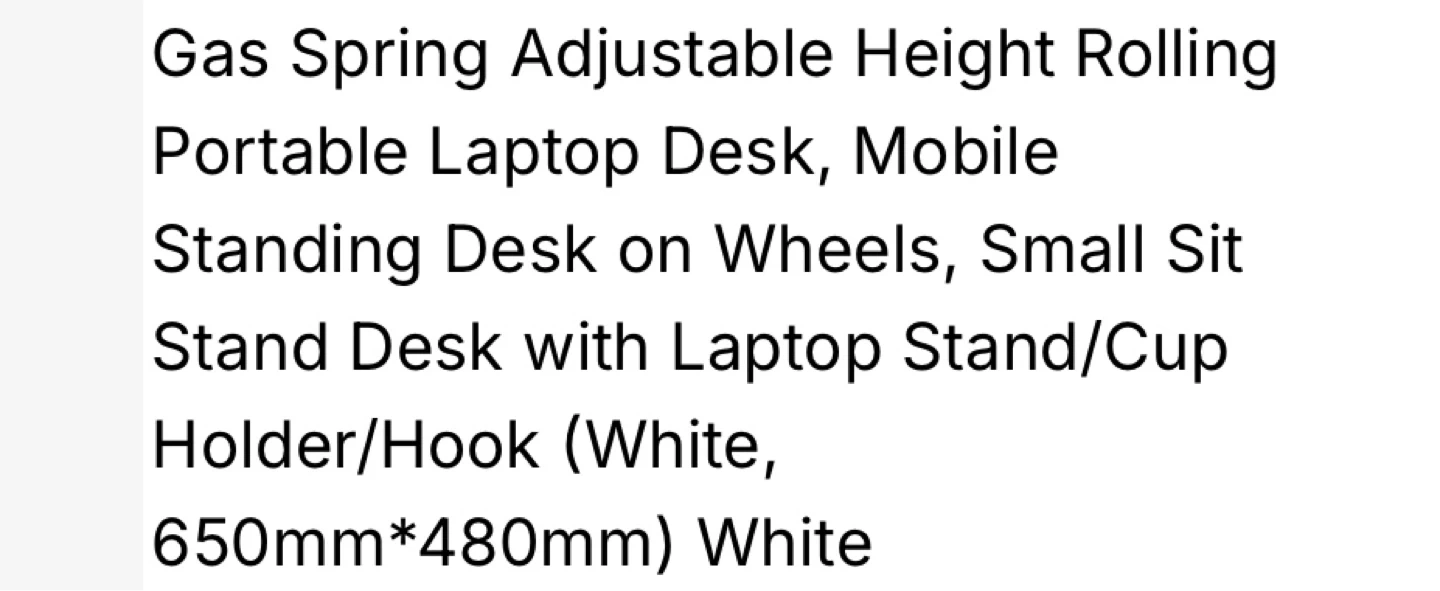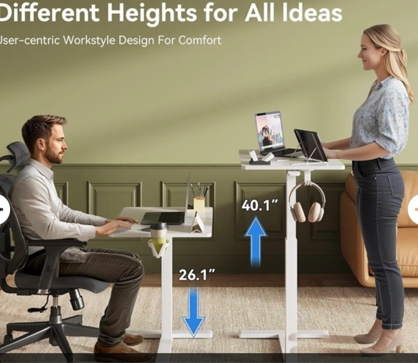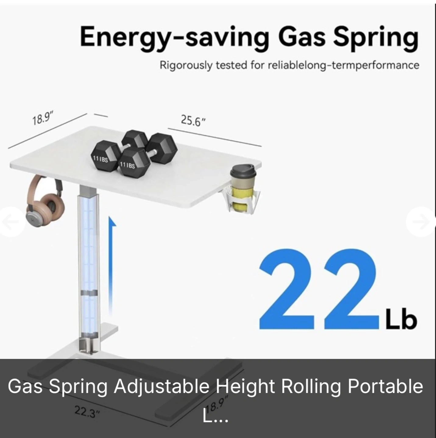 This portable standing desk has a gas spring for easy height adjustment. It's on wheels for mobility and includes a cup holder and hook. Height adjusts from 26.1" to 40.1" and the tabletop measures 25.6" x 18.9". Pick up near the border of Brampton and Caledon. Mayfield and Kennedy.